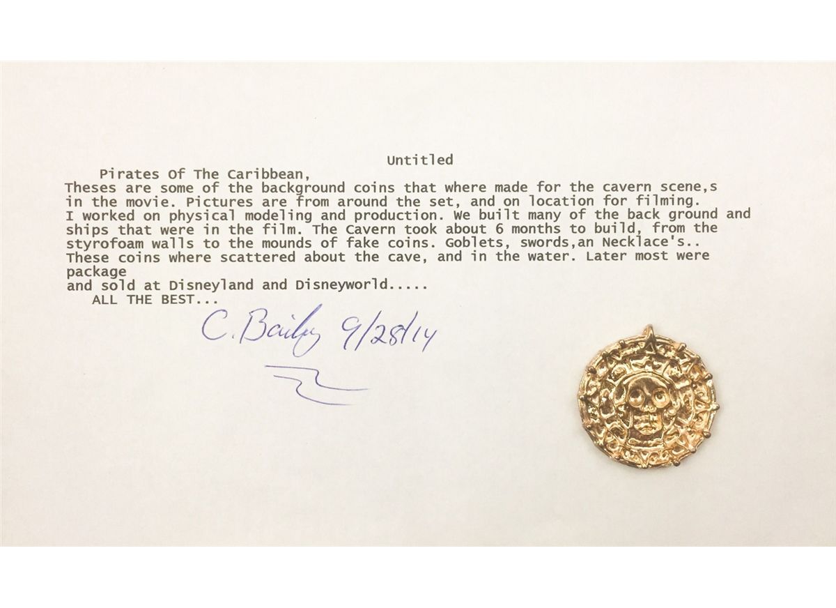 A GOLD COIN PROP FROM THE FILM PIRATES OF THE CARRIBEAN. ACCORDING TO THE LETTER THAT IS INCLUDED THE COINS WERE USED IN THE CAVERN SCENES. PLEASE LOOK AT THE LETTER IN THE ATTACHED PHOTOS FOR MORE DETAILS. THE BEHIND THE SCENES PHOTOS SHOWN ARE INCLUDED WITH THIS LOT.