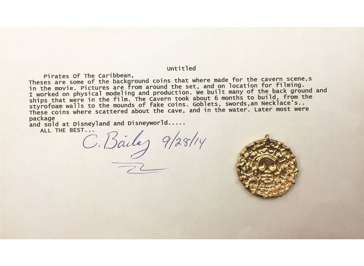 A GOLD COIN PROP FROM THE FILM "PIRATES OF THE CARRIBEAN". ACCORDING TO THE LETTER THAT IS INCLUDED THE COINS WERE USED IN THE CAVERN SCENES. PLEASE LOOK AT THE LETTER IN THE ATTACHED PHOTOS FOR MORE DETAILS. THE BEHIND THE SCENES PHOTOS SHOWN ARE NOT INCLUDED WITH THE LOT.