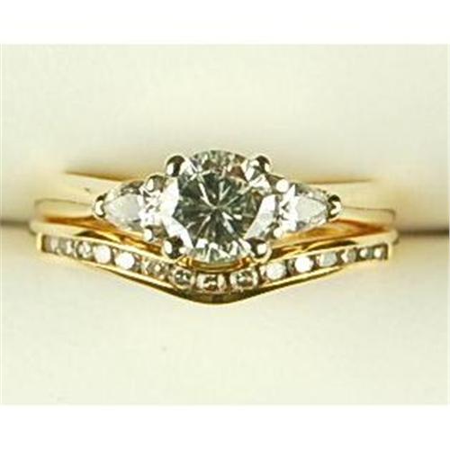 14k Yellow Gold Engagement Ring featuring a Brilliant Cut FINE 'VS' Quality Round DIAMOND = .57 CARATS! There is a pearshaped DIAMOND set each side, and the Diamond Total Weight = .82 CARATS! There is a matching 14k Yellow Gold Diamond Wedding Band. The Diamond Total Weight of this Wedding Set = ONE CARAT! It is a Size 5 and it can be resized.