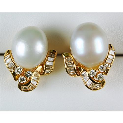 From a VERY FINE ESTATE, 18k Yellow Gold Earrings, each featuring a Rare 11MM SOUTH SEA PEARL surrounded by FINE DIAMONDS, round and Baguette. They have post style backs for pierced ears.