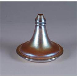Lot 857 GOLD FAVRILE COMPOTE COVER Nice gold favrile cover has light bluish iridescence and is the top for either a covered compote or a covered jar. Signed on the inside lip “LCT Favrile 8890L”. SIZE: 3-3/4” t x approx. 4” dia. CONDITION: Ground on top of finial, which appears to be standard for this type of lid, otherwise very good to excellent. 5-70878