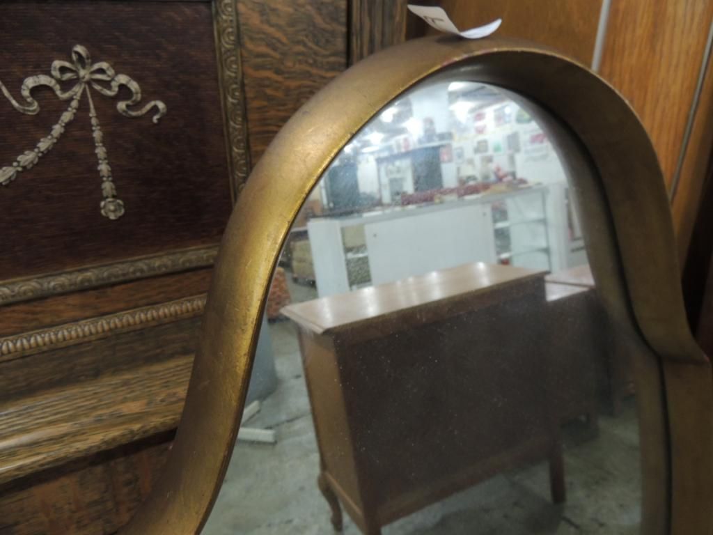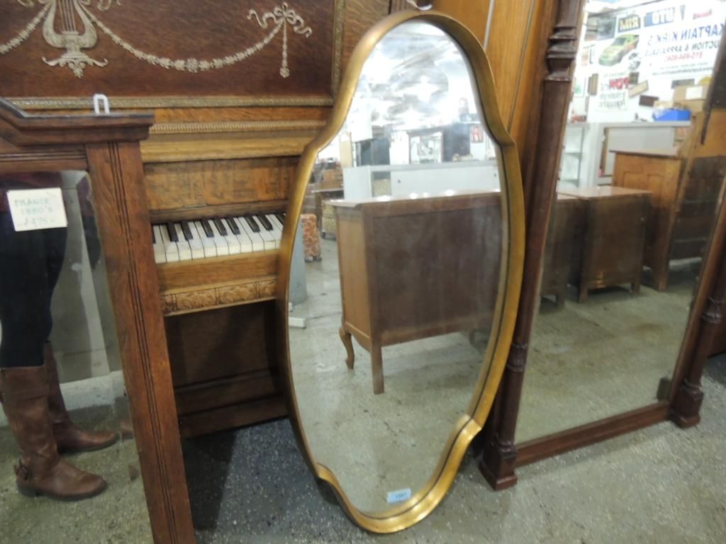 SHAPED GOLD FRAMED MODERN TRADITIONAL FRAMED MIRROR. AS SHOWN. SEE PHOTO FOR MORE DETAILS.