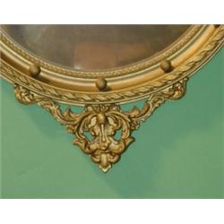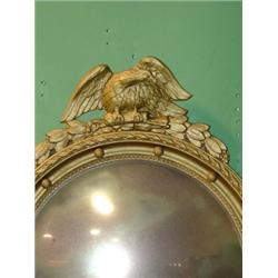 Gold gilt convex wall mirror with eagle decoration at top. 31" H, 21" Dia.