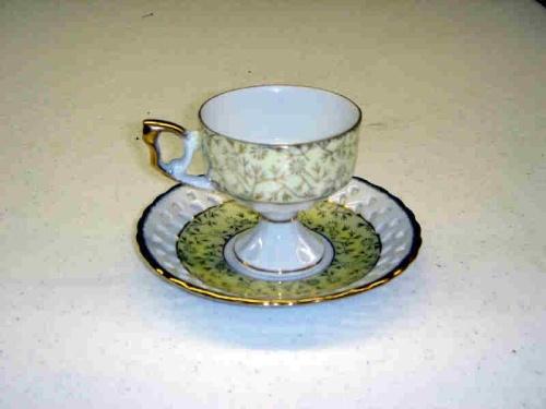 GOLD HANDLED YELLOW PRINT FOOTED CUP W/SAUCER