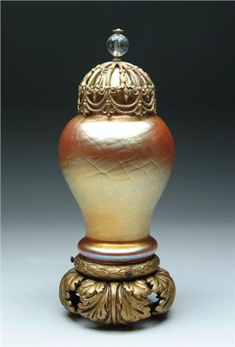 GOLD IRIDESCENT MANTLE LAMP. Extremely unusual mantle lamp has crackle design shade finished in rich gold iridescence. Shade rests in a cast brass leaf design base and is decorated on the top with a cast brass filigree cap with faceted crystal finial. Shade is attributed to Durand. SIZE: 14-1/2 in. t. CONDITION: Very good to excellent. 5-61058