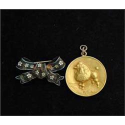 Lot 165 GOLD MEDALLION. 14kt yellow gold medallion has raised French poodle in the center and engraved “P.C.A.” below. Medallion weighs 11dwt and is marked “14k”. The medallion is hung from a gold filled and enameled bow pin. The pin has white and yellow enameled daisies with a light blue enameled trim around the bow. SIZE: Medallion 1-1/8” dia. CONDITION: Considerable wear to the gold plating on the bow and some enamel missing, otherwise good. 5-69617 (200-250)