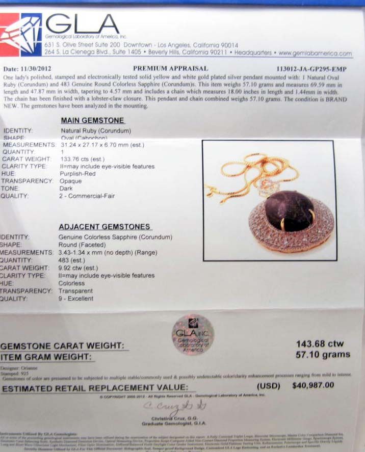 Appraisal of $40,987.00. Ruby center stone 133.76 cts, 483 Sapphires 9.92 cts. Total Weight 57.10 grams.