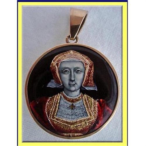 Antique Gold pendant set with a hand painted Limoges enamel miniature portrait of a young woman, Anne of Cleeves, fourth wife of England's King Henry the VIII.