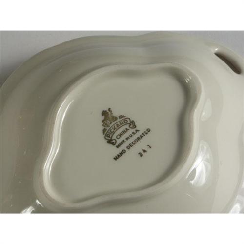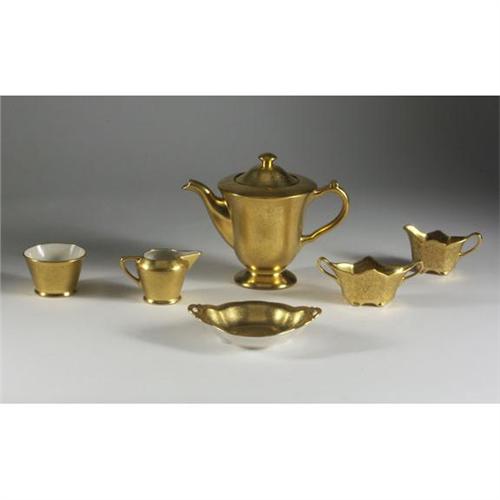 CHINA: A partial lot of Pickard China including a gold daisy/rose encrusted motif tea pot with lid, #594, U.S.A. 7.25'' H cream color inside, a smooth edged, open mouth sugar and creamer both #486, U.S.A., in the same design with cream colored interior, 2 ½'' H, a shallow bon-bon dish, #241, U.S.A, dual handles, same pattern, gold interior, cream exterior, 6/75'', and a creamer and sugar, gold daisy/rose encrusted exterior with sold gold interior, irregular edge, unidentified signature, no number, 2 ½'' H.