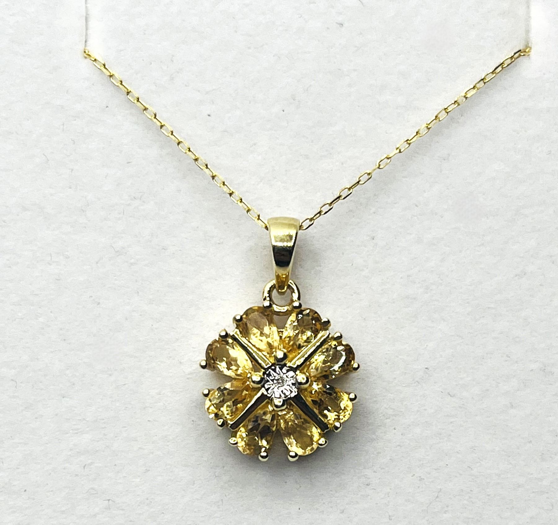 NATURAL DIAMOND (0.01CT) FLOWER PENDANT WITH GOLD PLATED STERLING SILVER CHAIN, W/A $340.00. CITRINE IS THE BIRTHSTONE FOR NOVEMBER. **ALL ITEMS MUST BE REMOVED BY 5PM SATURDAY, NOVEMBER 15TH 2025. ALL REMAINING ITEMS WILL BE SUBJECT TO A $6.00 PER DAY STORAGE CHARGE. ANY ITEMS REMAINING AFTER MONDAY, DECEMBER 1ST 2025 WILL BE CONSIDERED FORFEITED. NO REFUNDS WILL BE ISSUED FOR FORFEITED ITEMS. TO SCHEDULE A PICK UP APPOINTMENT CLICK HERE