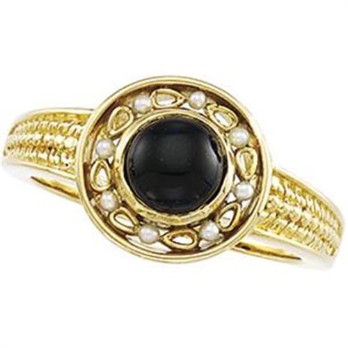 This 14k Yellow Gold Ring features a GENUINE BLACK ONYX encircled by CULTURED PEARLS. The ring is a size 6 and it can be resized.