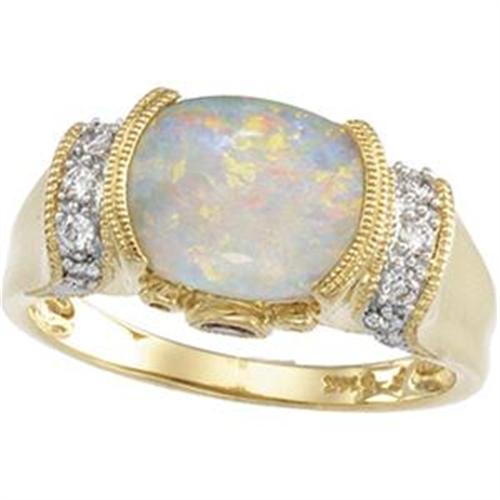 This 14k Yellow Gold Ring features a Cushion Cut GENUINE OPAL = 3 CARATS! There are 7 DIAMONDS set each side and the Diamond Total Weight = .20 Carats. And - there is a beautiful PINK TOURMALINE set front and back as accent. The Pink Tourmaline Total Weight = .14 Carats. This BEAUTIFUL AND UNUSUAL RING is a Size 7 and it can be resized just for you.