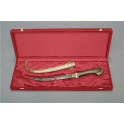 Formerly the property of a Royal Family: important, Islamic dagger with antique blade, mounted in superbly carved 18K yellow gold sheath by the jeweler to the Royal Family, gem set with emerald and two ruby cabochons and with rhinocerous horn and 18K yellow gold handle, hallmarked; L: 15 1/2"