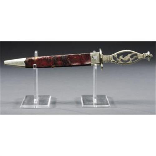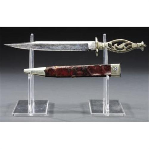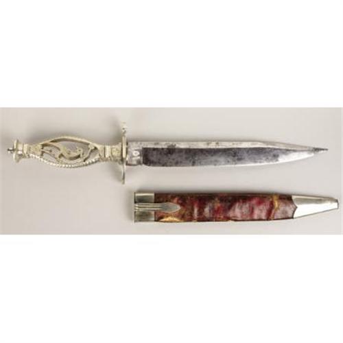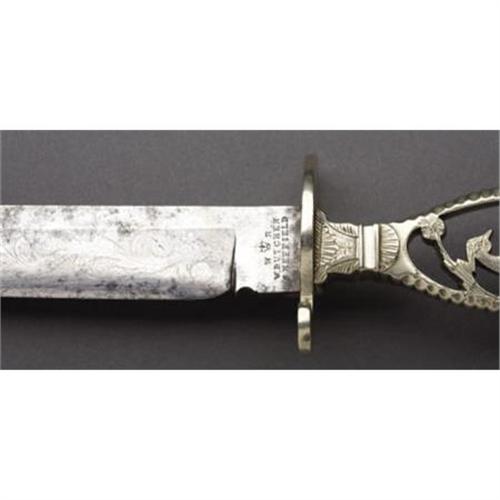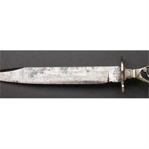 <B>“GOLD RUSH BOWIE KNIFE” WITH PEACOCK AND ENGLISH CROWN SILHOUETTE, HAS MOTIF circa 1830's.</B></I> This single edged blade, total length 13.25", with floral etching both sides, has an open nickel silver handle and an 'S'-shaped guard. The motifs are a bird sitting on a vine above a crown near the pommel of the grip. Stamped at the ricasso are "W. Butcher, Sheffield" below the namesake of the butcher knife crown with "W. R." initials. The Bowie includes an original leather sheath with plain nickel throat and tip, total length 8.25” <BR><BR><B>Condition: </B></I>The knife has been lightly sharpened and has some light pitting. <BR><BR> Note: The next lot in this sale is an ambrotype photo of a man with this type of Bowie knife in his belt making this a treasure of American history rarely seen in the collecting community.<I> From The William Turner Collection.</B></I><BR><BR><b>Shipping:</b> Bats, Clubs, Sticks, Swords, Rif (<a target="_blank" href="http://www.heritageauctions.com/common/shipping.php">view shipping information</a>)