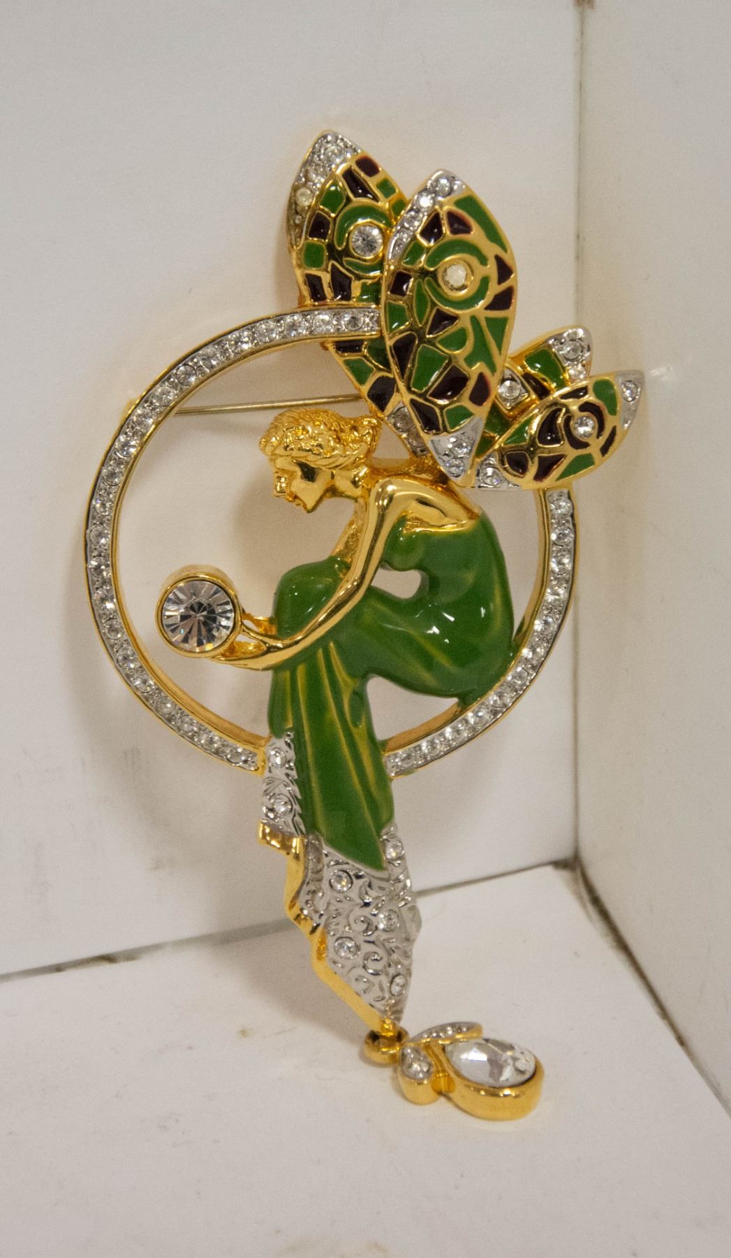 GOLD TONE ENAMEL AND CRYSTAL FAIRY IN MOON BROOCH