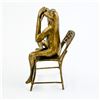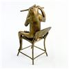 #8046 - VINTAGE GOLD TONE METAL FROG SITTING ON A CHAIR PLAYING THE FLUTE. FROG PLAYING MUSIC SCULPTURE - HOME OR OFFICE DECOR. UNMARKED - AGE AND MAKER UNKNOWN. WEIGHTS ROUGHLY 740 GRAMS. MEASURES: 7.5” (19 CM) TALL BY 3.5”(9 CM) WIDE AND 4” (10 CM) DEEP