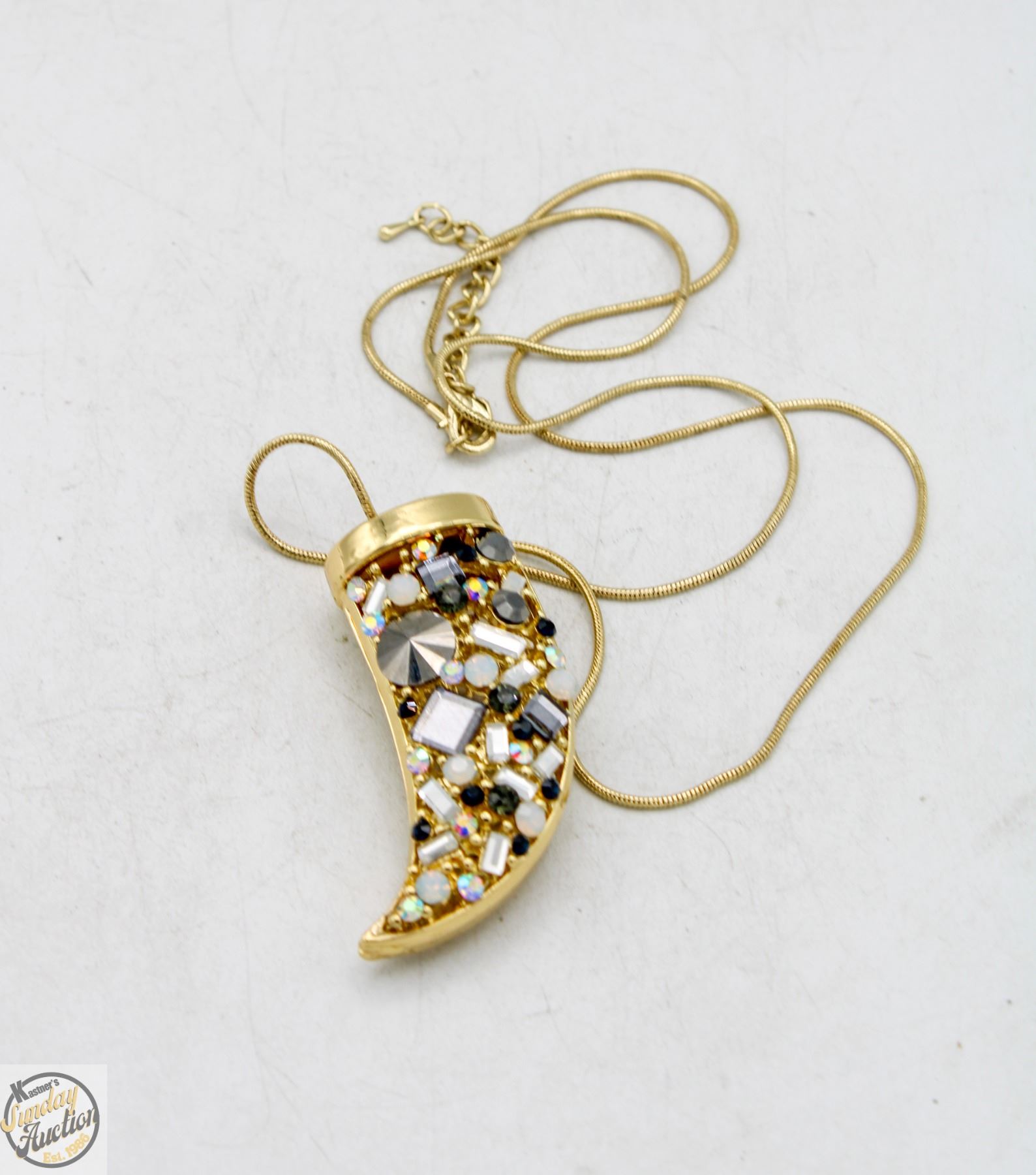 GOLD TONE NECKLACE WITH JEWELED TOOTH PENDANT