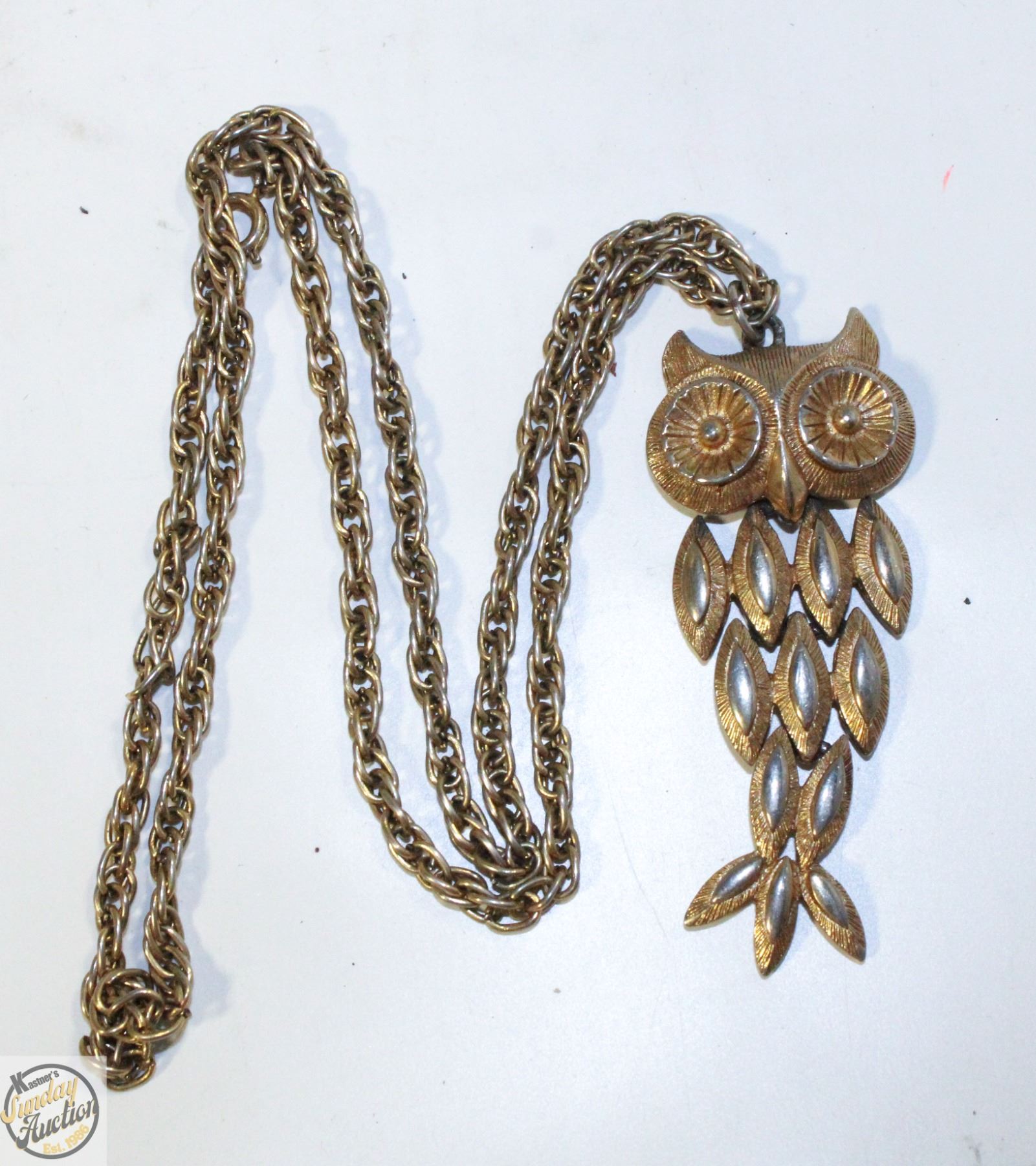 GOLD TONE OWL IN FISH SHAPE PENDANT NECKLACE