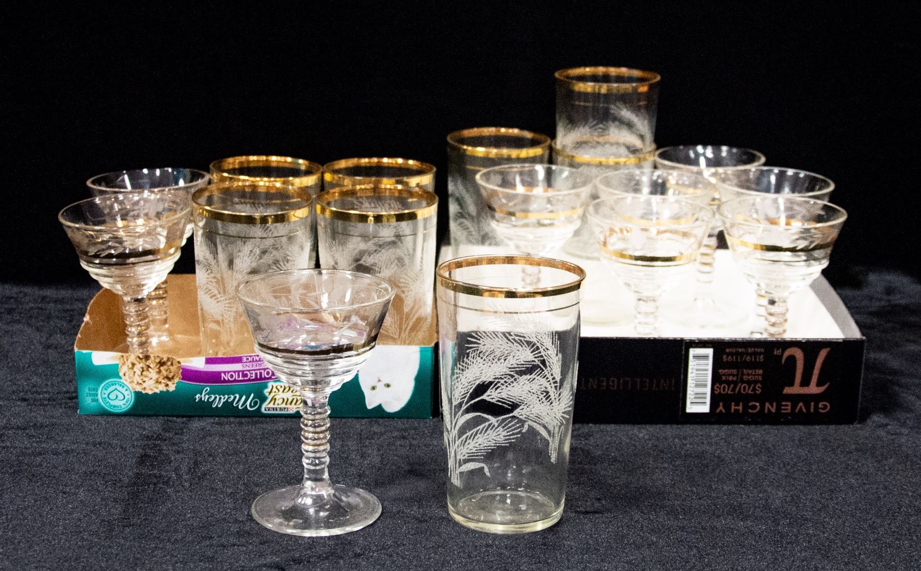 8 WATER GLASSES 9 LONG RIMMED GLASSES