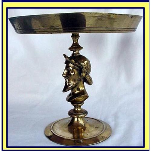 Tazza / centerpiece / card tray with figural bust and armorial, dating to the 19th century.<BR>Measures 7 1/2inches high and diameter of tray is 7 1/2inches accross. It is heavy - weighs 3 lb 6 oz. Made of bronze or brass in a nice soft golden colour.<BR>Great quality. Round foot and tray seperated by a figural bust with knops at either end. The head is that of a Viking / Norse King. Long face, droopy moustache, great detail to hair and beard. <BR>The middle of the tray has a small engraved armorial.<BR>Condition is generally good. There is one small brown spot on the tray and it looks as though it may have been varnished at one point, the remnants of which need to be cleaned off.