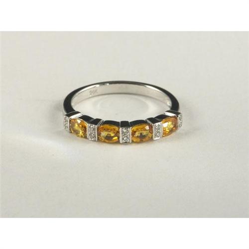 RING: Tasteful 14k white gold lady's ring set with golden sapphires and diamonds. The oval cut sapphires measure approximately 1.10 ctw and are transparent. The diamonds measure approximately 0.06 ctw, have VS1 to VS2 clarity and G color. Appraisal included.