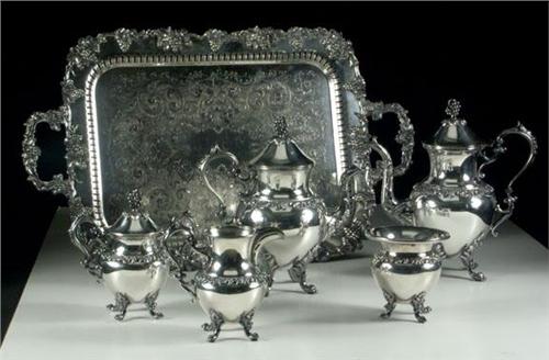 SILVERPLATE: A six piece silver plated (silver on copper) tea service consisting of the coffee pot, tea pot, creamer, and sugar bowl with lid, waste bowl, and serving tray, hallmarked Goldfeder Silverware Company (established in Brooklyn, NY, in 1932). Grape leaf and cluster pattern on finials and borders. The coffee pot measures 12'' nine cup, eight cup tea pot, sugar bowl with cover measures 8'' , creamer 6'', and the waste bowl 5''. The lid weld on the coffee pot is broken. The footed tray measures 27''L x 16 1/8''W with a matching grape leaf and cluster rim with reticulated edge and inscribed scroll work, also hallmarked Goldfeder, circa 1935, minor surface scratches noted.