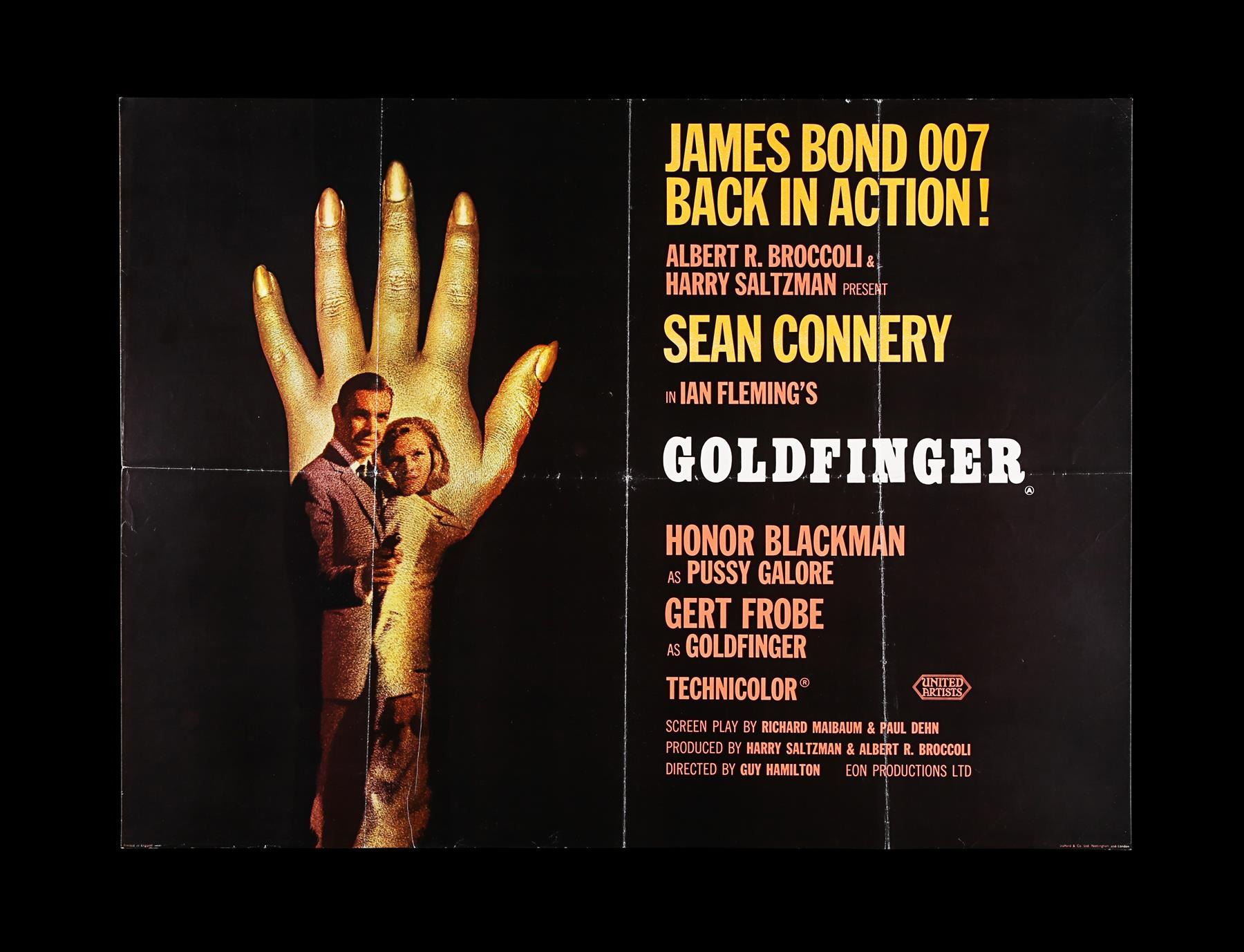 UK Quad "Style-B" poster for "Goldfinger" (1964), this being the rarer alternate design with Bond and Pussy Galore placed against a background hand. It is commonly thought that this more "demure" design was commissioned for particular use in Ireland, this is unlikely as UK Quad posters were routinely used. This is unlikely. It was common for alternate Quad designs to be created for big film titles at this time, often one design being prepared for use in the supposedly more cosmopolitan/ metropolitan centres and another for the rest of the country. We have evidence that the "Style-A" Goldfinger Quads were employed in the Republic and can see no reason why this one particular Bond film would have necessitated a special "Irish" poster design. Irrespective, the "Style-B" design was produced in far smaller quantities than the corresponding "Style-A" poster. 30" x 40" (76 x 102 cm). Condition: Good Unrestored, folded with slight fold line wear, including tiny paper loss at crossfolds and minor edge creasing. The poster was printed on a semi-gloss format. Overall in very good condition. Artist: Robert Brownjohn £5000 - 7000 VAT Status: M