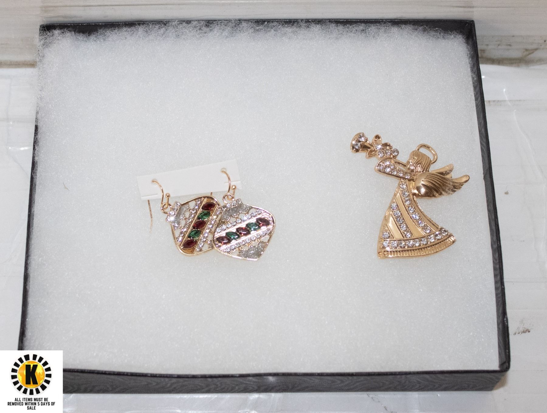 GOLDPLATED CRYSTAL ANGEL BROOCH, CRYSTAL EARRINGS