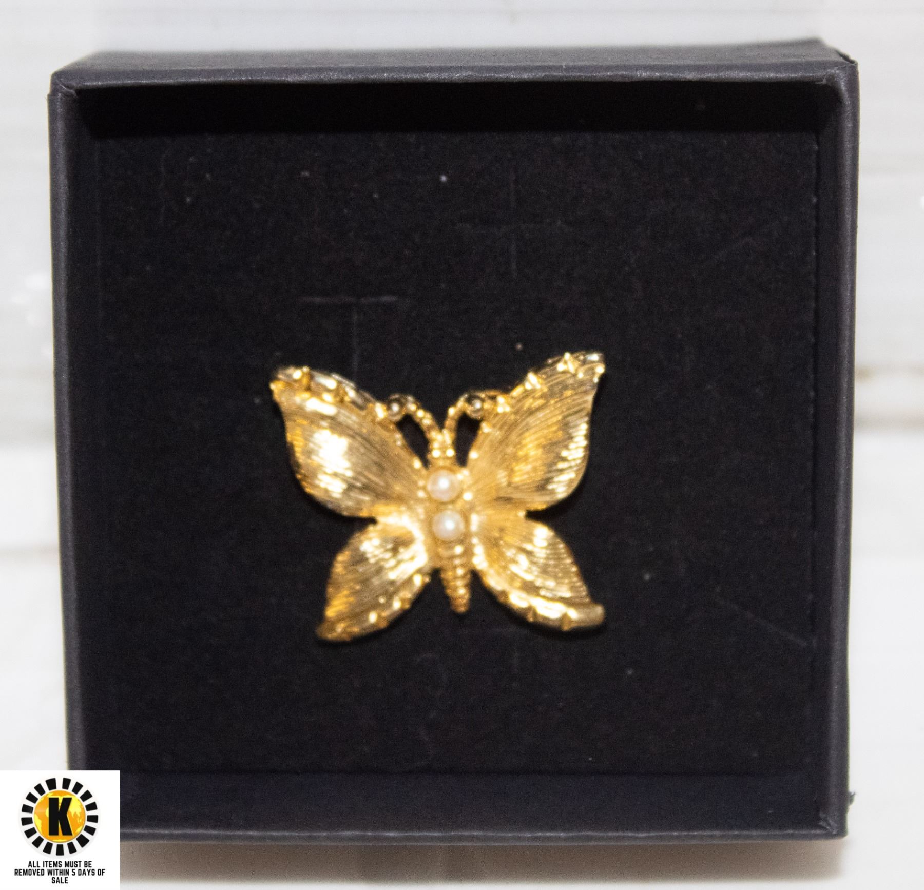 GOLDTONE BUTTERFLY W FAUX PEARLS BROOCH IN BOX