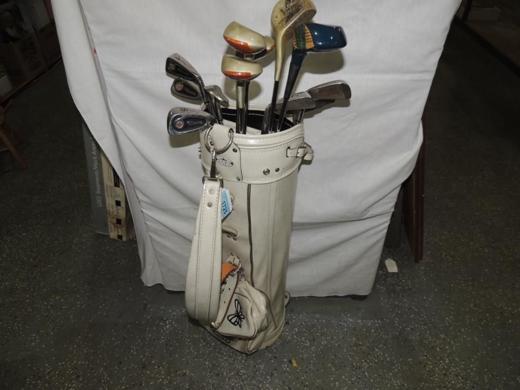 GULF CLUBS AND GOLF BAG. WHTE BAG. SPORTS EQUIPMENT AS SHOWN. SEE PHOTO FOR MORE DETAILS.