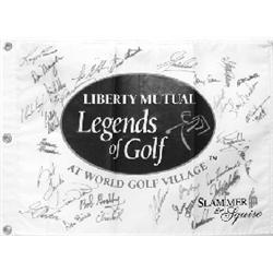 <b>1547. GOLF LEGENDS SIGNED FLAG </b>A great golf item, a Liberty Mutual Legends of Golf flag measuring 20" x 15", signed in felt tip by 29 tour members, including: <b>CHARLES COODY</b>, <b>GEORGE ARCHER</b>, <b>BOB GOALBY</b>, <b>CHICHI RODRIGUEZ</b>,<b> JAY HAAS</b>, <b>GENE LITLER</b>, <b>HUBERT GREEN</b>, <b>GAY BREWER</b>, <b>LOU GRAHAM</b>, <b>J. C. SNEAD</b>, <b>LEE ELDER</b>, <b>TOMMY AARON</b>, and many more. In fine condition, perfect for display!<b>$600-700</b>