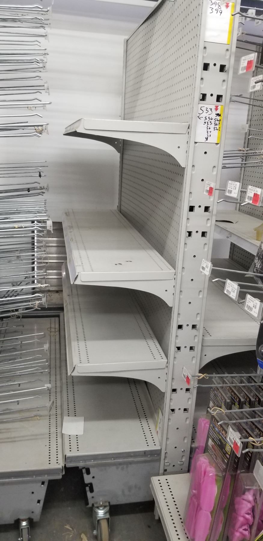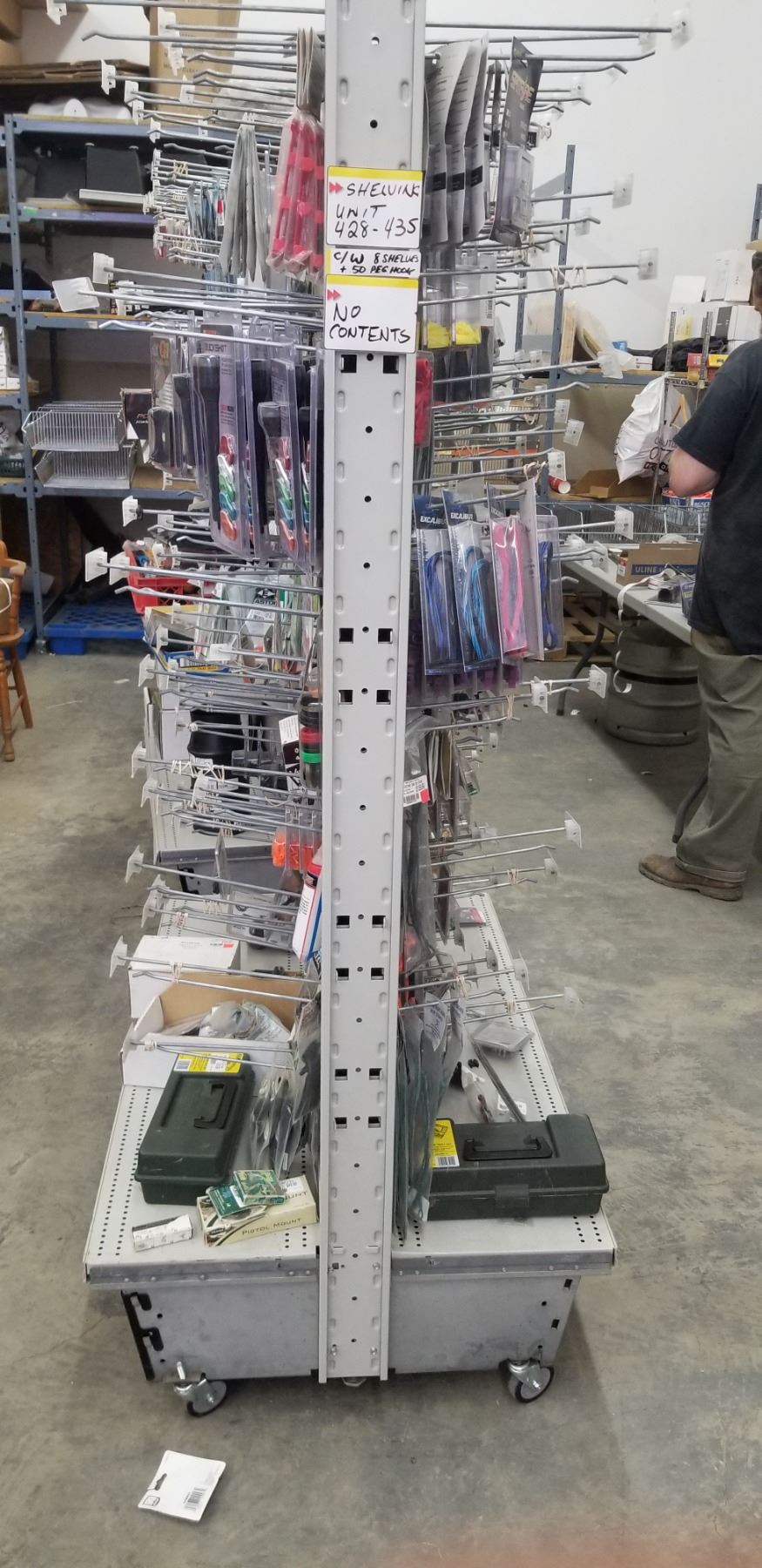 GONDOLA SHELVING ON WHEEL 48"L X 33"W X 75"H COMES WITH 8 SHELVES 12X48" AND 50 PEG BOARD HOOKS MINIMUM PRICE $200.00 EACH