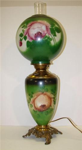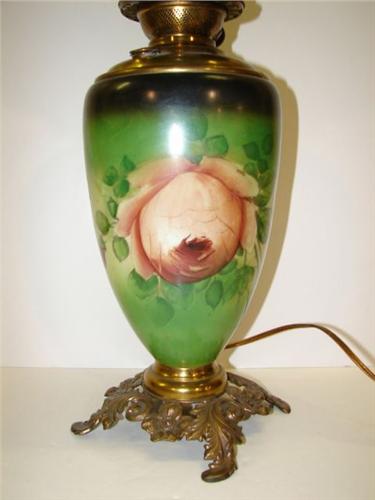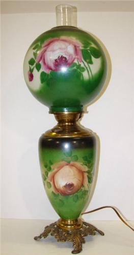 GONE WITH THE WIND LAMP. Hand painted rose decorated bowl & shade. Floral decorated brass base. Burner knob is marked “Success”. Electrified. 27” H to top of clear glass chimney.