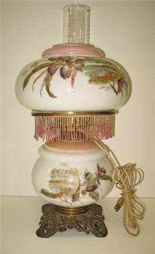 GONE WITH THE WIND STYLE LAMP. Electrified. Brass base and white glass bowl and shade. Bowl and shade are transfer decorated with flowers and river scene. Shade has fringe around bottom. 18" H