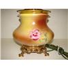 GONE WITH THE WIND STYLE LAMP. Electrified. Hand painted floral decorated shade and bowl. Polished brass base and font. Burner knob is marked “Made in U.S. of America”. 24” H
