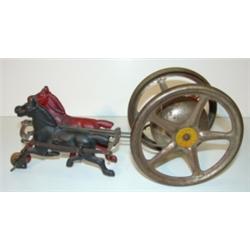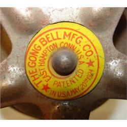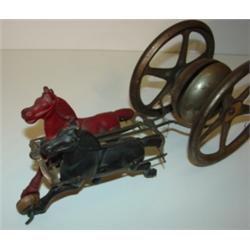 The Gong Bell Manufacturing Co. bell pull toy with cast iron horses. Marked on wheels "The Gong Bell Mfg. Co.-East Hampton, Conn.-Patented May 20, 1924". Horses retain original paint. Some rust and pitted is visible on bell and wheels.