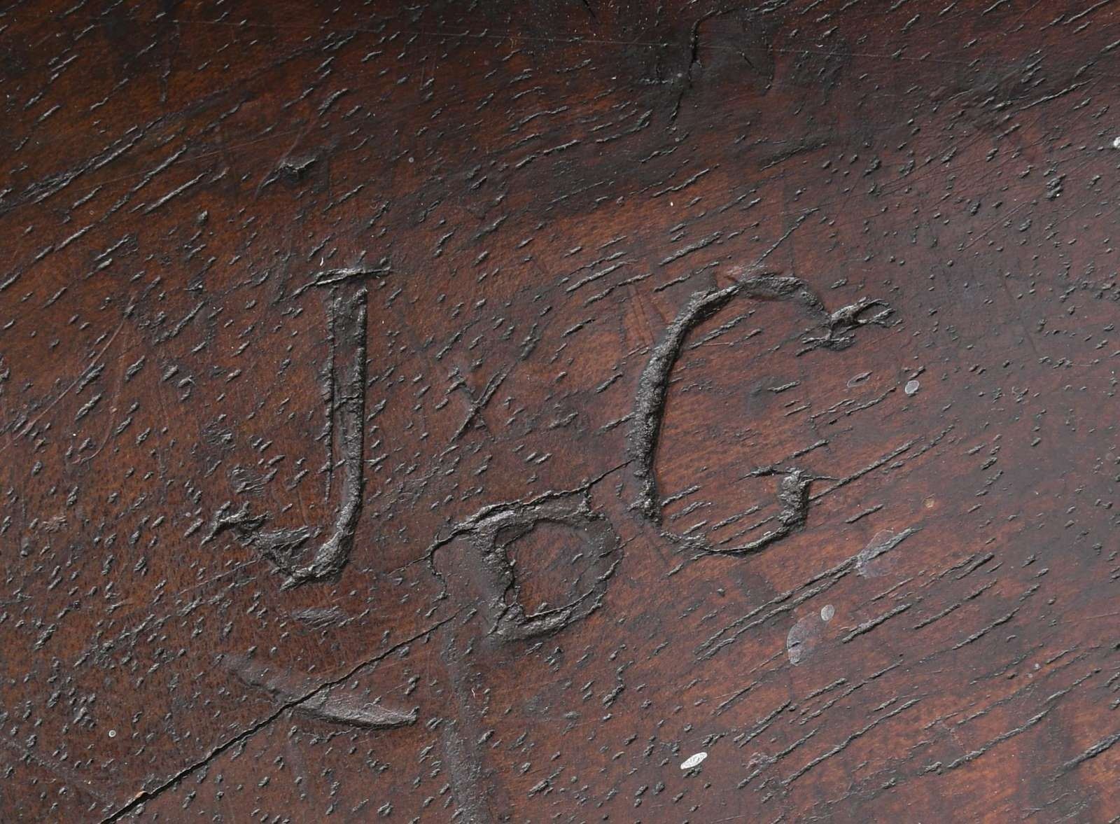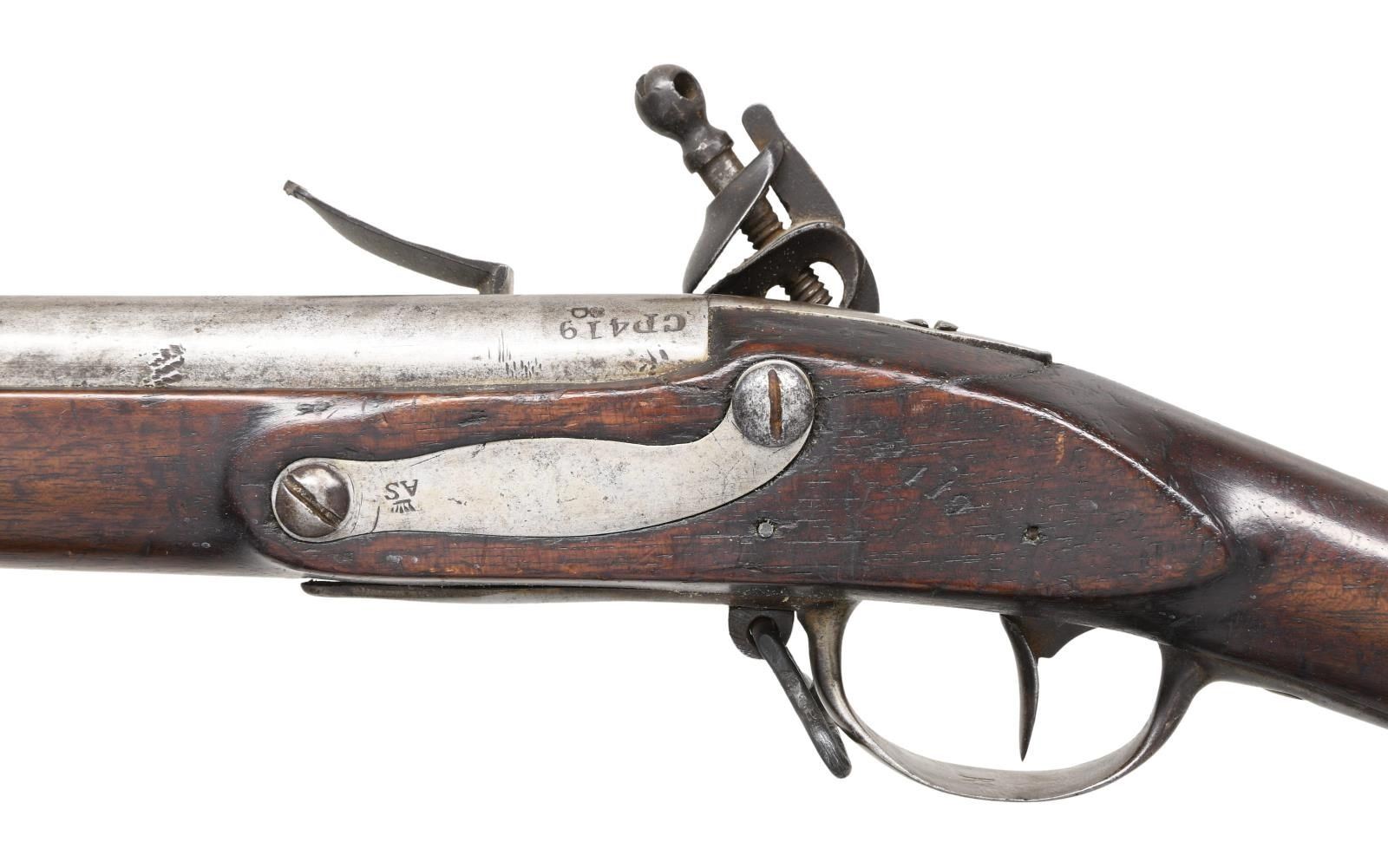 OF PENNSYLVANIA MARKINGS. Cal. 70. NSN. Standard configuration w/ 44-3/4" barrel. Rear is stamped w/ crowned "D" proof & "CP419". This mark is also found on left side of stock. Lock w/ flat faced reinforced cock, inset faceted pan, bridled friction frizzen & feather spring with bulbous finial also has crowned "D" proof at top & is engraved "Charleville". Walnut stock is iron mounted & has handrail comb. Standard type mounts are iron & unmarked except for sideplate which is stamped w/ a crown over "AS". Left side of stock is carved w/ the initials "J*C" "D". CONDITION: fine original flint. Metal parts w/ cleaning to pewter gray over light pitting & some marks. Stock has hand worn patina at carry points & appears to be reoiled. There are cracks at top, both sides around barrel tang. All markings on metal are sharp and clear. A very presentable Charleville w/ American markings. (01-24515/MGM). ANTIQUE. $2,000-3,000.