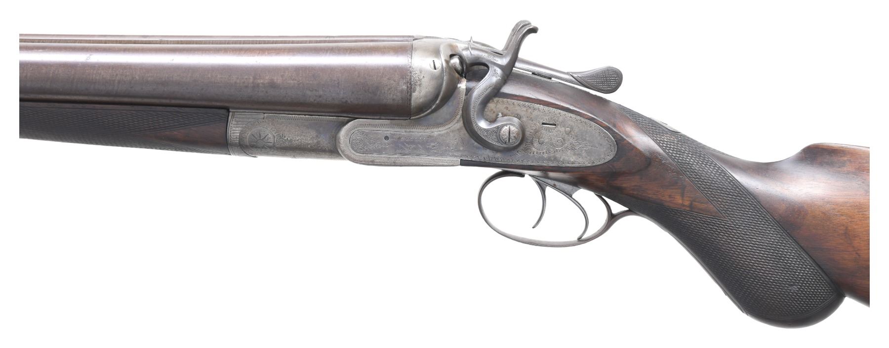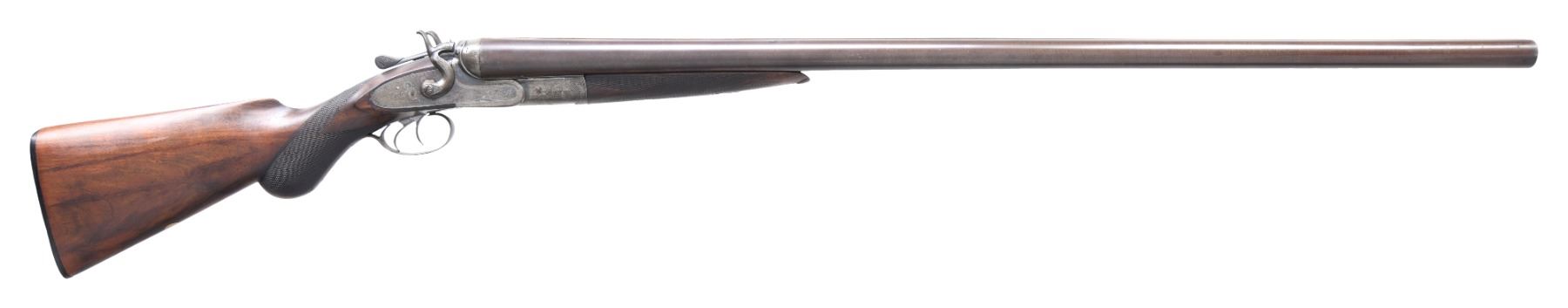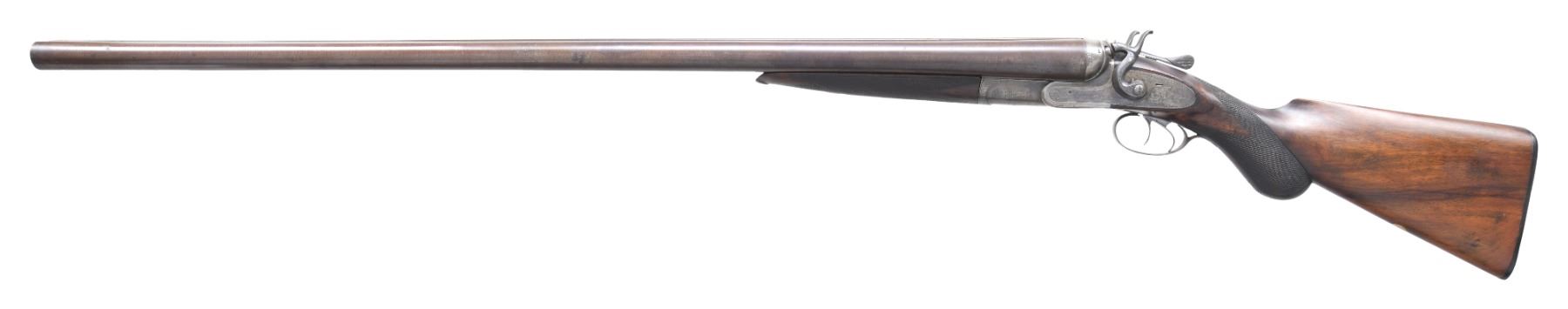 Cal. 8 Ga. S# 3667. The 36" barrels are engraved "Henry Tolley, London. Fine Damascus" on concave game rib with doll head extension. Bottoms of barrels are stamped with Birmingham black powder proofs for 9 bore. Large case hardened top lever action with pivoting third fastener is fitted with front spring locks having tall serpentine rebounding hammers. Action is engraved with about 30% coverage sprays of scroll within a zigzag and scroll borders. "H. TOLLEY" is on each lockplate over small game scenes with spaniel and snipe on left; pointer and grouse on right. Trigger guard bow is scroll engraved. S# is on tang. Round knob pistol grip stock of lightly streaked European walnut measures 13-1/2" over checkered hard rubber buttplate. Point pattern checkering is on grip and a vacant gold oval is on toeline. Matching splinter forend with hard rubber tip has Deeley release. MEASUREMENTS: STOCK: DAH: 2-13/16". DAC: 1-13/16". CAST: neutral. LOP: 13-1/2". WEIGHT: 14 lb. 2 oz. CONDITION: fine. Barrels retaining most of their original brown with some scattered flecking and darkening. Action and locks retain most of their case hardening color. Top lever and trigger guard are brown in color, possibly flaked. Stocks show old oil refinish and are dull. Most marks and dings have been removed. Checkering lightly re-cut. Bores are good, mostly shiny with scattered pitting. Action is tight. Locks are good. (01-26978/MGM). ANTIQUE. $3,000-5,000.