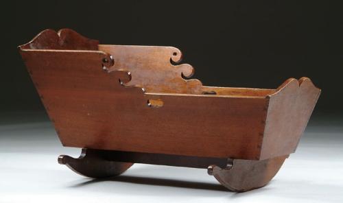 GOOD ANTIQUE WALNUT CRADLE. Nicely carved scroll sides with cutout hand holes, shaped rockers and nice dovetailed construction. SIZE: 21-1/2in. h x 40in. l x 20in. w. CONDITION: Refinished, very good. 9-25763