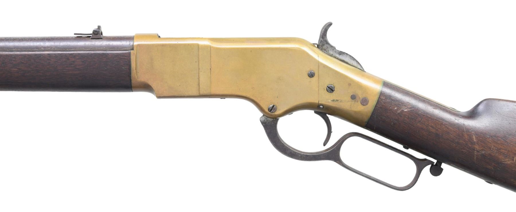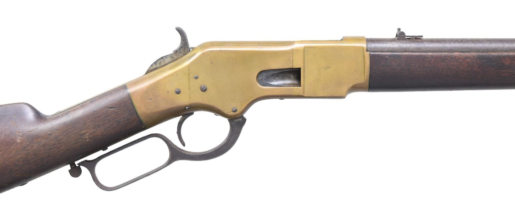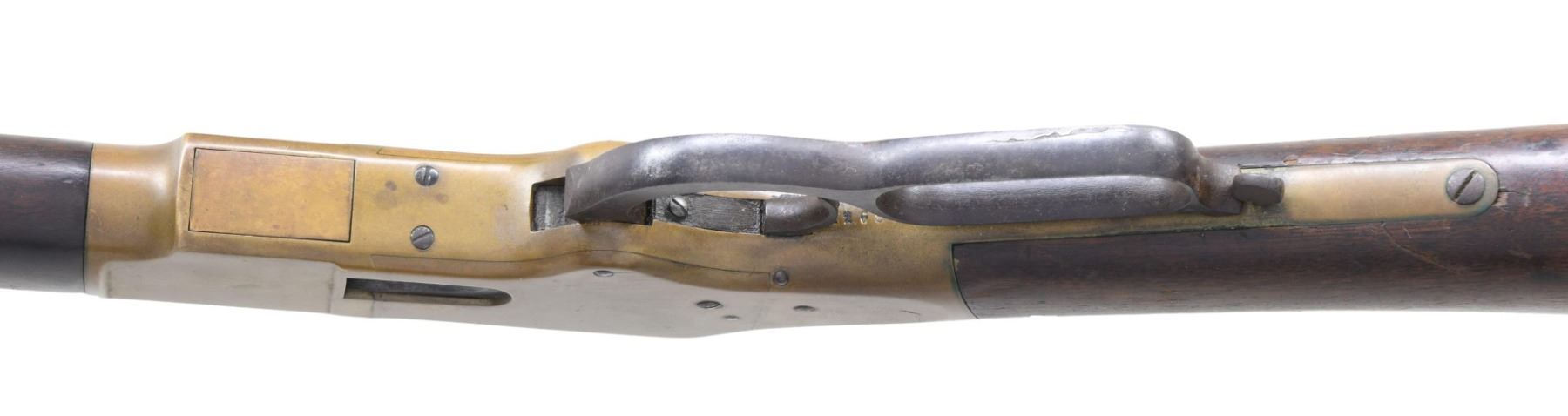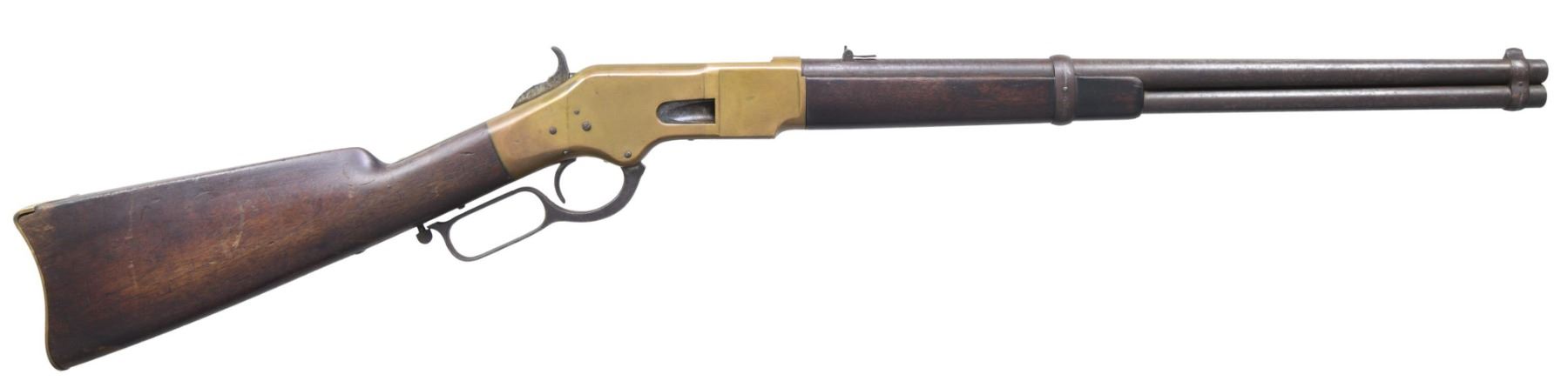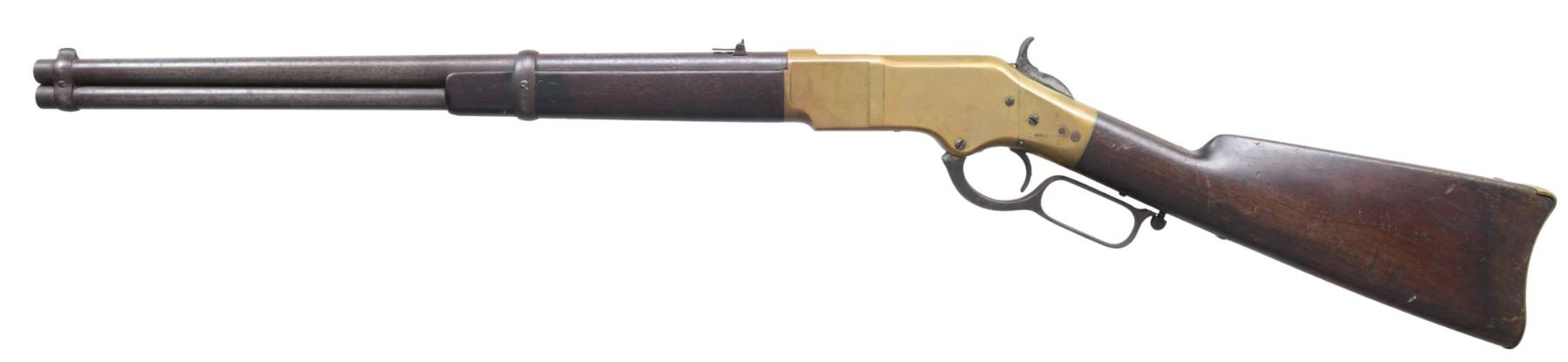 Cal. 44. S# 126801. Standard configuration of the classic "yellow boy" Winchester 1866 Lever Action Saddle Ring Carbine manufactured in 1876. This survivor is well above average, all original, 20" round barrel with full magazine tube, 2-line "Kings's Improvement" address, two position folding rear sight, integral blade front sight attached to barrel band, saddle ring has been removed flush to the frame, straight grain walnut stock, brass buttplate with trap for cleaning rod which is missing one of three pieces. All in all, a very attractive Winchester 1866 carbine made at the height of western cowboy history. UNATTACHED ACCESSORIES: Cody Firearms search form showing date S# applied November 28, 1875, and shipped April 1, 1876. CONDITION: very good overall, smooth light mustard patinaed brass frame, barrel has mottled brown/gray patina, barrel address is crisp, stock is sound & well fit with small gap at top of butt plate, scattered cosmetic scratches & dings. Mechanics are fine, good rifled bore. (01-26397/JS). ANTIQUE. $3,000-5,000.