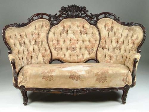 GOOD CARVED ROSEWOOD VICTORIAN SOFA. Three tufted panel back having large pierce carved crest with roses, flowers and open scroll design. Carved arms and serpentine front seat rail with leaf and decorative carving. French style carved front legs. Presently upholstered in a flower design which needs replacing. SIZE: 44” h x 70” w x 22” seat depth x 17” seat h. CONDITION: Repair to right side of back crest, upholstery as is. Generally good. 9-25566