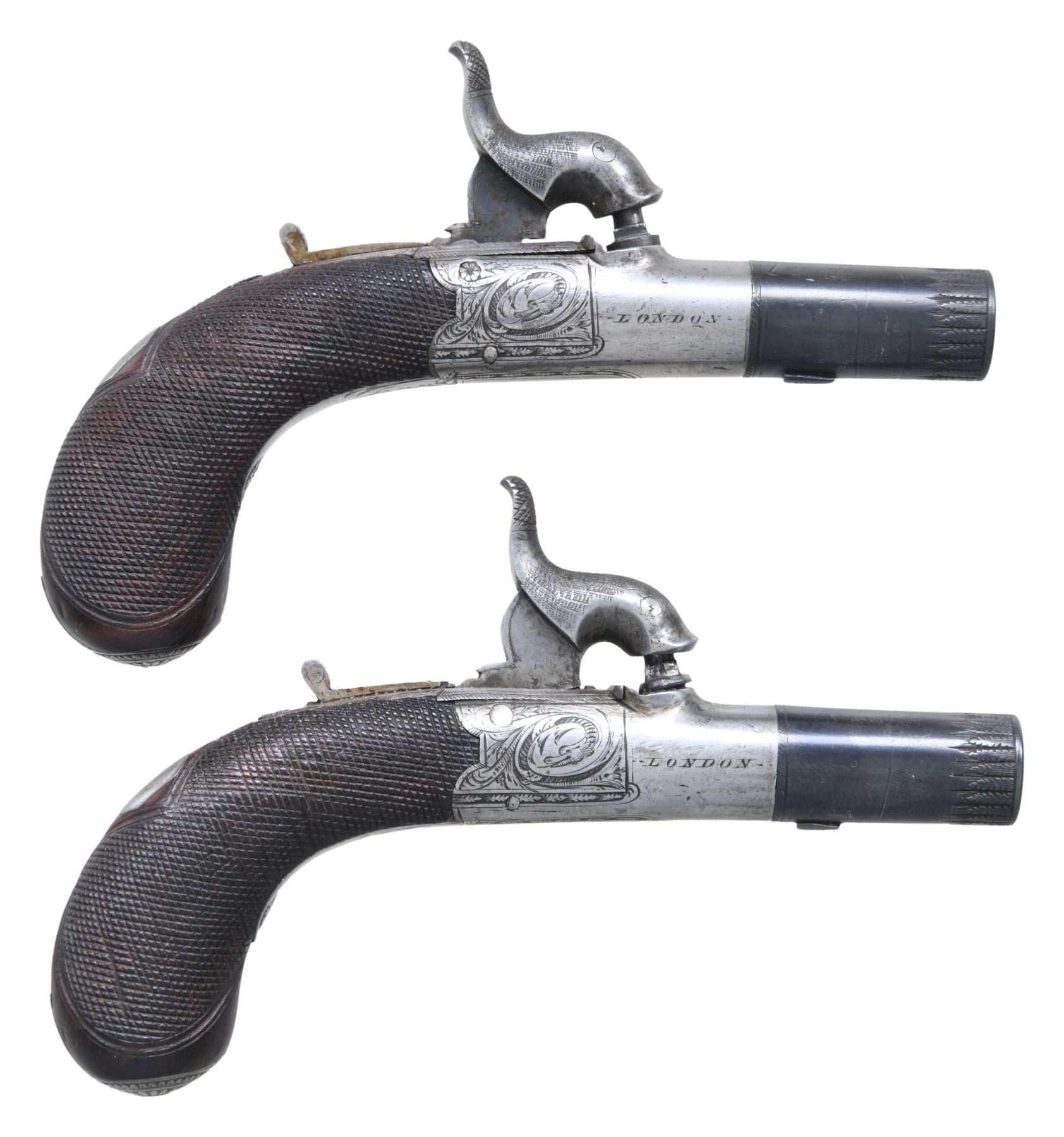 MUFF PISTOLS WITH FOLDING TRIGGERS AND SCREW BARRELS BY BOND. Cal. 38. (both). S# NSN (both). The 1-1/4" blued barrels are engraved with spears around muzzles and have bottom lugs for removal. Small boxlock actions with dolphin head hammers are fitted with half cock safetys and blued folding triggers. London black powder proofs are stamped on bottoms. Front parts of actions are engraved "BOND" "59 LOMBARD St" on lefts and "LONDON" on rights. Left rears are scroll engraved; right rears are engraved with coiled sea monsters. Checkered walnut bag grips with engraved steel caps have vacant silver rectangles at tops. UNATTACHED ACCESSORIES: pistols are housed in a period case with burl elm wood top with inlet brass circle. Interior is lined in green cloth and reproduction C. Parker label is in lid. Bottom compartment is semi-French fitted for pistols and a good array of correct size accessories including: steel nutcracker type mould with barrel wrench that fits these barrels, small copper bodied powder flask, ebony cap box, pewter oil bottle, ebony handled nipple wrench, cleaning jag, turn screw and the original key. CONDITION: pistols have re-blued barrels over a fair number of scratches from use of barrel wrench. Actions cleaned to silver gray. Traces of blue remain on folding triggers. Stocks are good with what appears to be original finish; checkering lightly worn. Bores are good with some light frosting. Mechanically good. Case is very fine with most of its original exterior finish. Interior cloth, probably renewed, is very fine. Label is artificially aged. Accessories are very good; showing cleaning. A very attractive set. (01-26845/MGM). ANTIQUE. $2,000-3,000.