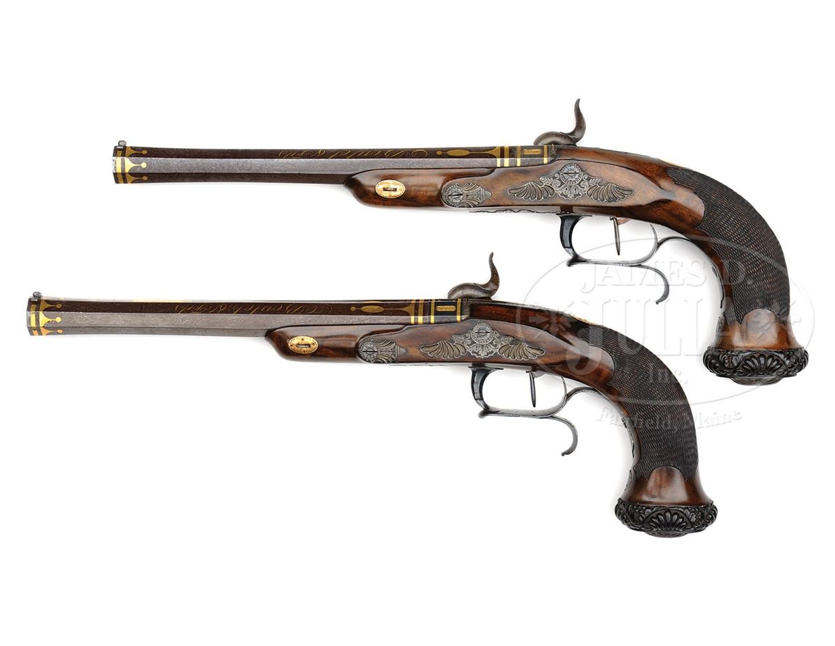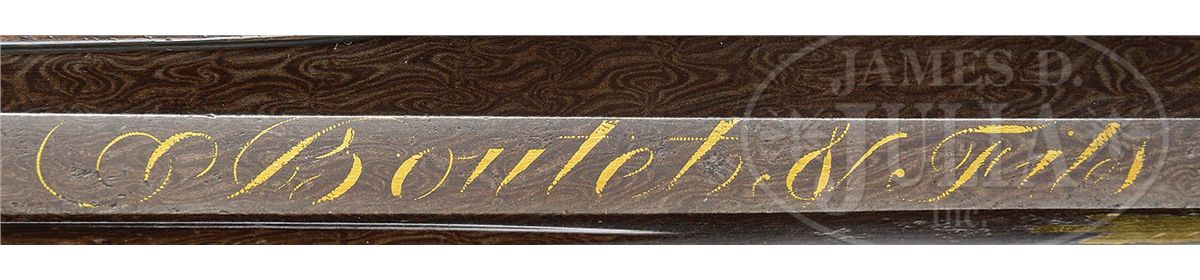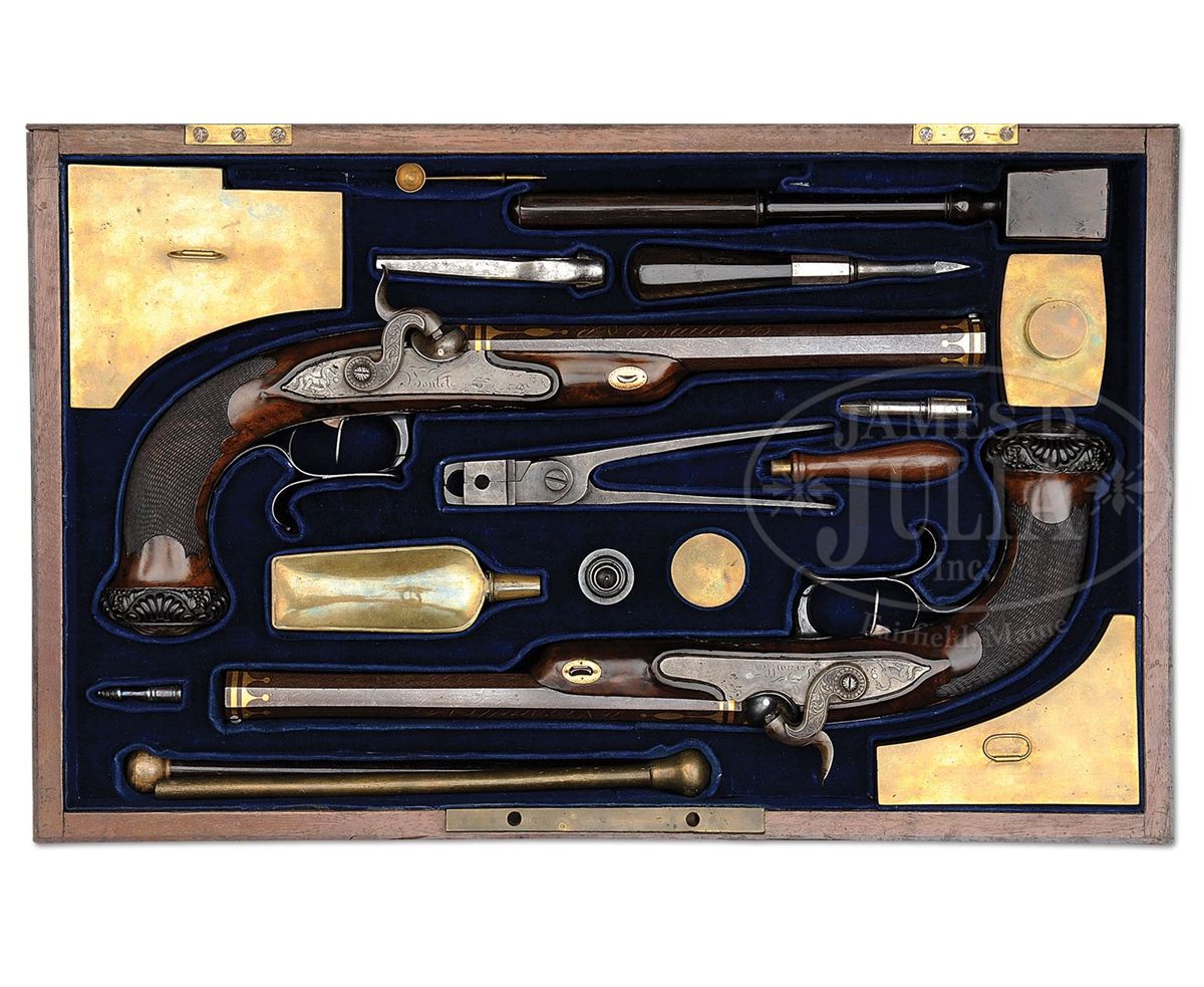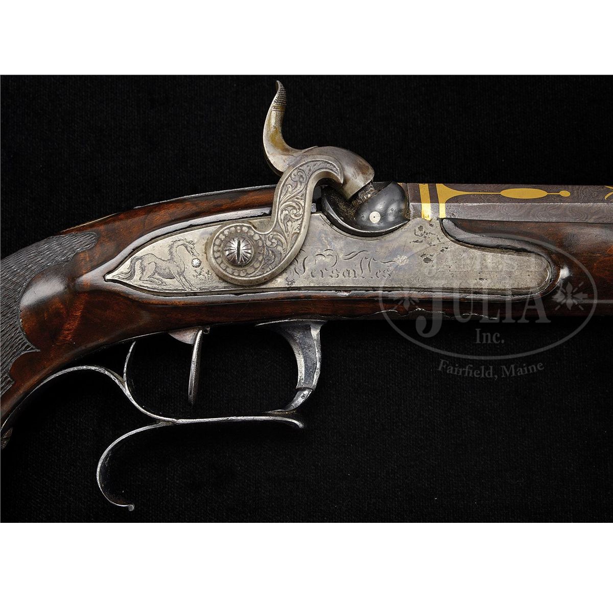 NSN. Oct swamped bbls with typical Boutet micro groove rifling are elaborately inlaid with gold stars, bands and signed in full in gold "Boutet et fils Versailles". One pistol numbered "337". Converted to percussion during their working life, these pistols are an excellent example of the empire style made famous by Boutet and LePage, both of whom created masterpiece firearms for the court of the Emperor Napoleon. In addition to the elaborate gold work on the bbls, the thumbpiece and bbl key surrounds are made of high carat gold. Breeches bear Boutet's gold stamp and the tangs are engraved with empire ornament. Side nail plates are engraved with empire ornament and chiseled. Trigger guards chiseled en suite and trigger guards bear classic Boutet motifs of birds and flowers. Butt caps are carved ebony with scalloped steel inserts en suite with trigger guards and side plate. Lockplates are engraved with fanciful dragon horse. One pistol signed on the lock "Boutet" the other "Versailles". Walnut half stocks are beautifully figured and finely checkered. French case contains all accessories including bullet mold, flask, mallet, screwdriver, wad cutter, cleaning tools and oil bottle. NOTES: Nicholas Noel Boutet and his son worked at Versailles from 1788 until 1818. In 1794, the French government established a special workshop at Versailles that produced luxury arms under Boutet. Nicholas Boutet was without a doubt the most important gunsmith of the late 18th and early 19th century. All pistols and rifles and swords made by Boutet display the very finest workmanship whether on a plain military pistol or a magnificent silver and gold mounted garniture. PROVENANCE: Collection of Dr. Douglas Sirkin. CONDITION: Pistols are good as refinished. Trigger guards have minor pitting under reblue. Bbls have minor pitting under very attractive maiden hair Damascus brown. Breeches are blued, lockplates have considerable traces of case hardening. Stocks have high polish piano varnish. Case is relined and otherwise restored. 4-49822 MZ33