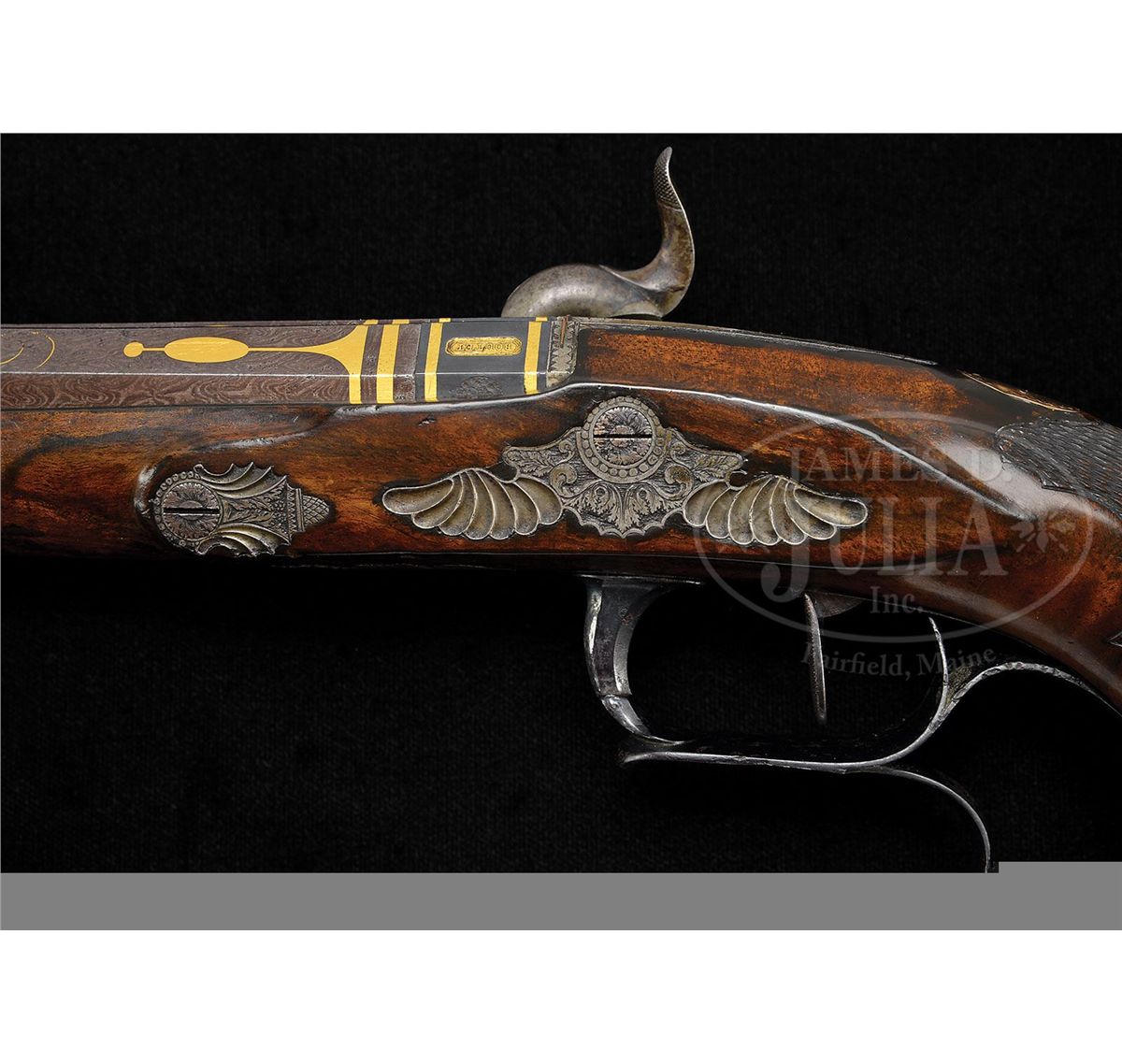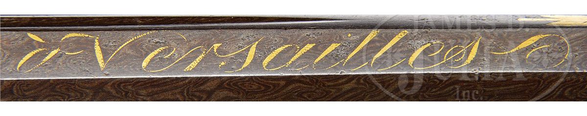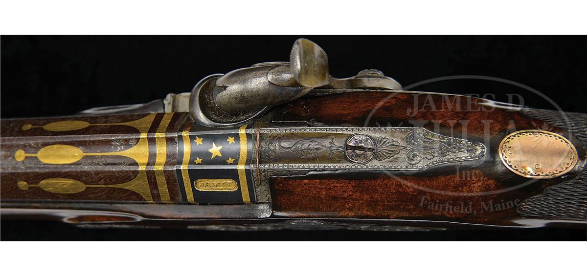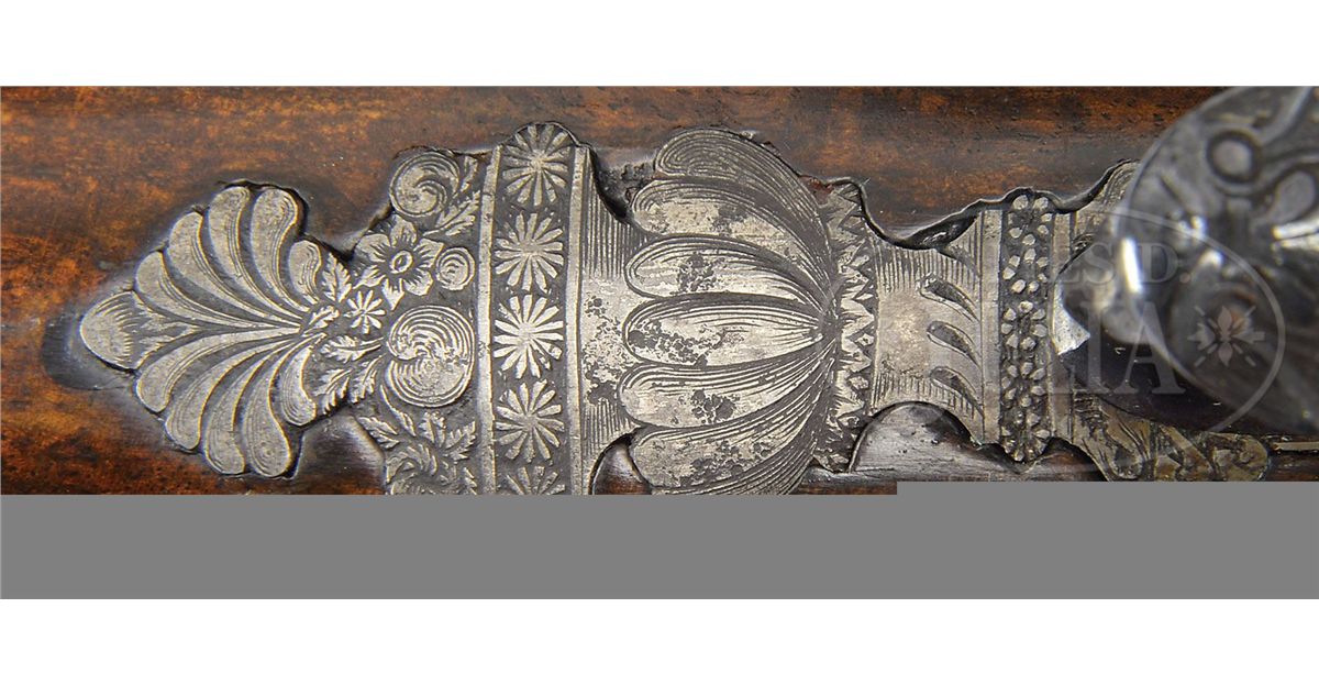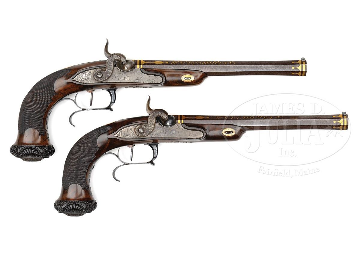 NSN. Oct swamped bbls with typical Boutet micro groove rifling are elaborately inlaid with gold stars, bands and signed in full in gold "Boutet et fils Versailles". One pistol numbered "337". Converted to percussion during their working life, these pistols are an excellent example of the empire style made famous by Boutet and LePage, both of whom created masterpiece firearms for the court of the Emperor Napoleon. In addition to the elaborate gold work on the bbls, the thumbpiece and bbl key surrounds are made of high carat gold. Breeches bear Boutet's gold stamp and the tangs are engraved with empire ornament. Side nail plates are engraved with empire ornament and chiseled. Trigger guards chiseled en suite and trigger guards bear classic Boutet motifs of birds and flowers. Butt caps are carved ebony with scalloped steel inserts en suite with trigger guards and side plate. Lockplates are engraved with fanciful dragon horse. One pistol signed on the lock "Boutet" the other "Versailles". Walnut half stocks are beautifully figured and finely checkered. French case contains all accessories including bullet mold, flask, mallet, screwdriver, wad cutter, cleaning tools and oil bottle. NOTES: Nicholas Noel Boutet and his son worked at Versailles from 1788 until 1818. In 1794, the French government established a special workshop at Versailles that produced luxury arms under Boutet. Nicholas Boutet was without a doubt the most important gunsmith of the late 18th and early 19th century. All pistols and rifles and swords made by Boutet display the very finest workmanship whether on a plain military pistol or a magnificent silver and gold mounted garniture. PROVENANCE: Collection of Dr. Douglas Sirkin. CONDITION: Pistols are good as refinished. Trigger guards have minor pitting under reblue. Bbls have minor pitting under very attractive maiden hair Damascus brown. Breeches are blued, lockplates have considerable traces of case hardening. Stocks have high polish piano varnish. Case is relined and otherwise restored. 4-49822 MZ33