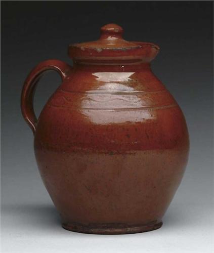 GOOD COVERED GLAZED REDWARE PITCHER. Orange/brown glaze with black speckling has a double incised line at shoulder with a wavy line in between. Cover with simple finial fits well. PROVENANCE: Ex-Jane Wilson Collection. SIZE: 8-3/4” h x approximately 6-1/2” at widest. CONDITION: Minor roughness to top rim. Otherwise very good. 9-27563