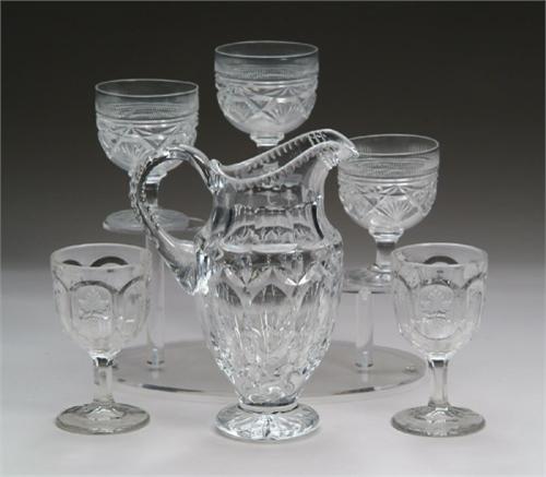 GOOD CUT GLASS HANDLED FOOTED PITCHER AND FIVE MISCELLANEOUS GOBLETS. Nice quality 10in. pitcher with notched design applied handle and beveled cutting on a heavy footed base, unmarked. Three 5in. footed cut goblets, unmarked, high quality. Two 6in. pressed glass clear goblets. CONDITION: Very good. 9-26333