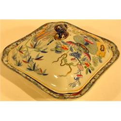 GOOD DECORATED MASON'S IRONSTONE COVERED VEGETABLE BOWL, first-half 19th century, with gilded finial, having a square design with inset corners, soft colorful decoration; 10 inches square