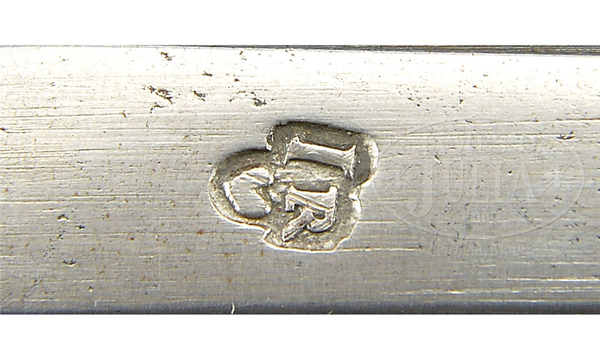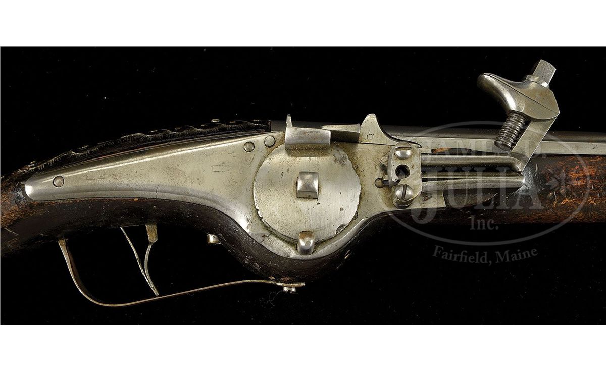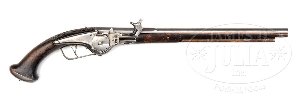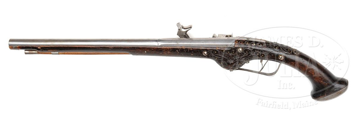 NSN. Characteristic Dutch lock with stud at bottom of wheel and three screws in the lockplate. Stock is carved with rudimentary scrolls in raised relief on a punctate ground enhanced with brass nails. Oct to round bbl struck with a maker's mark "IR" over a heart. Ebonized fruitwood full stock retaining some original finish. PROVENANCE: Collection of Dr. Douglas Sirkin. CONDITION: Overall very good. Metal is clean and bright, both lock and bbl and steel butt cap. Stock with some wear to ebonized finish, but overall very good. No replacements other than ramrod. Good sound example of this most desirable type. 4-49793 MZ27