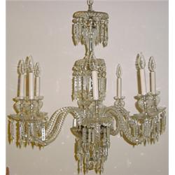 GOOD GEORGE III STYLE EIGHT-LIGHT CUT CRYSTAL CHANDELIER, early 20th century, with elegantly scrolled and spiral cut crystal arms, the multiple baluster form cut crystal column and bobeches detailed with crystal prisms; 32 inch diameter; 30 inch height