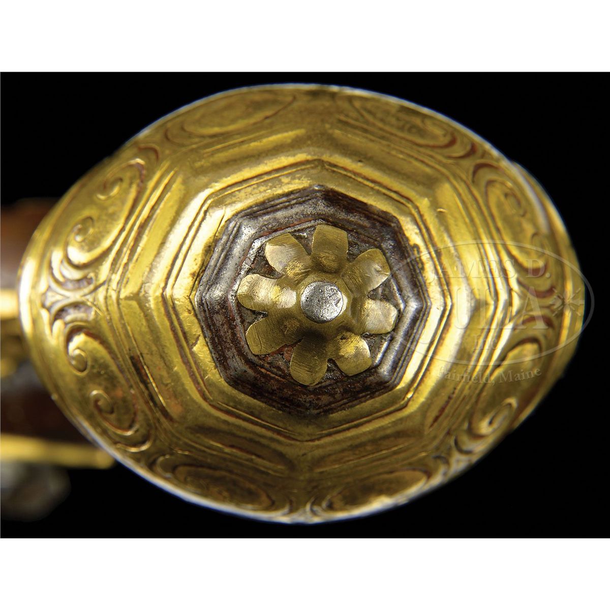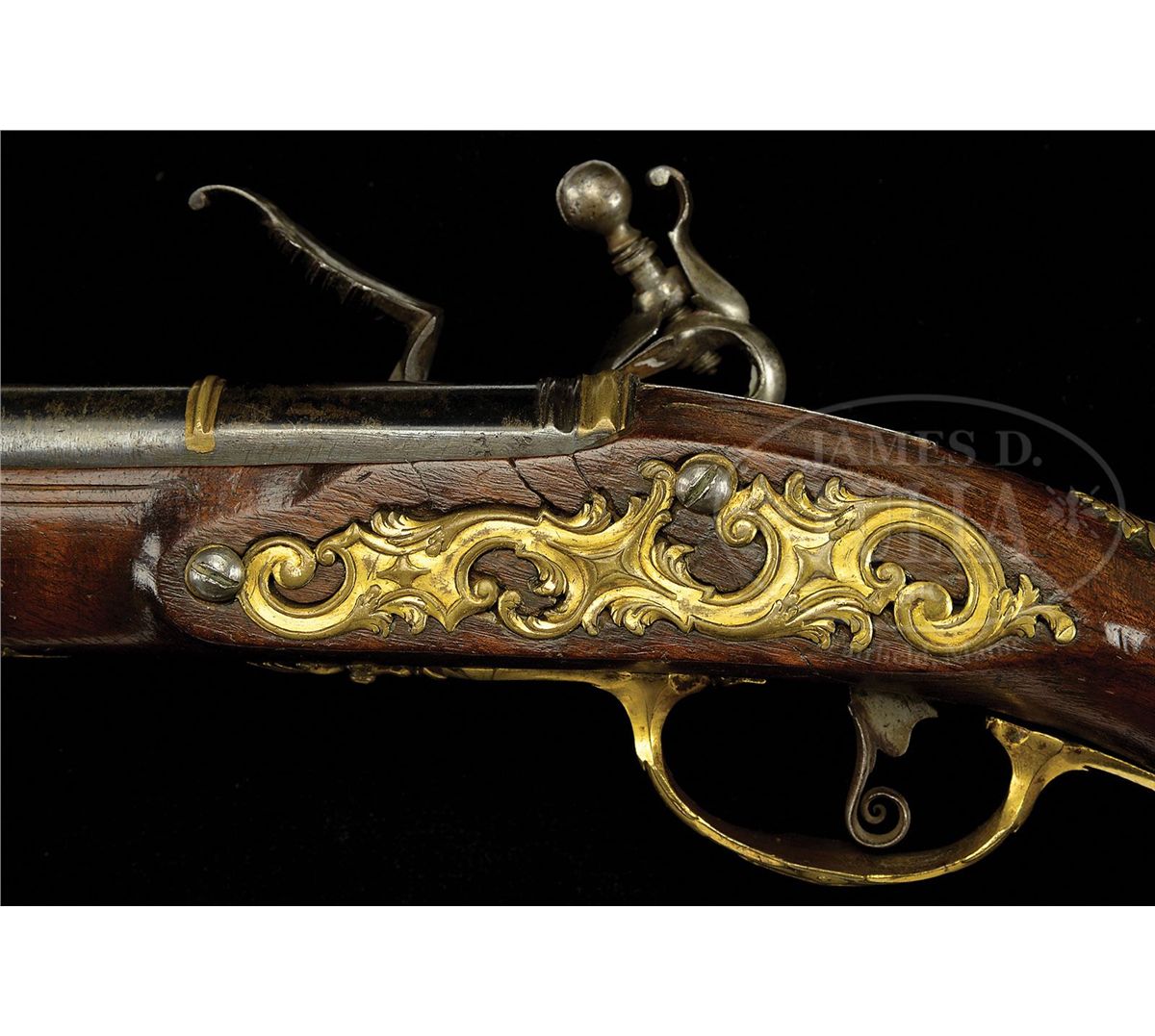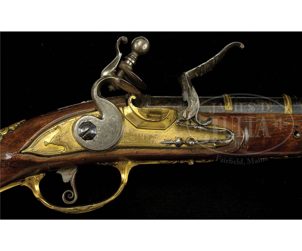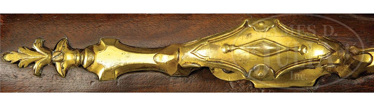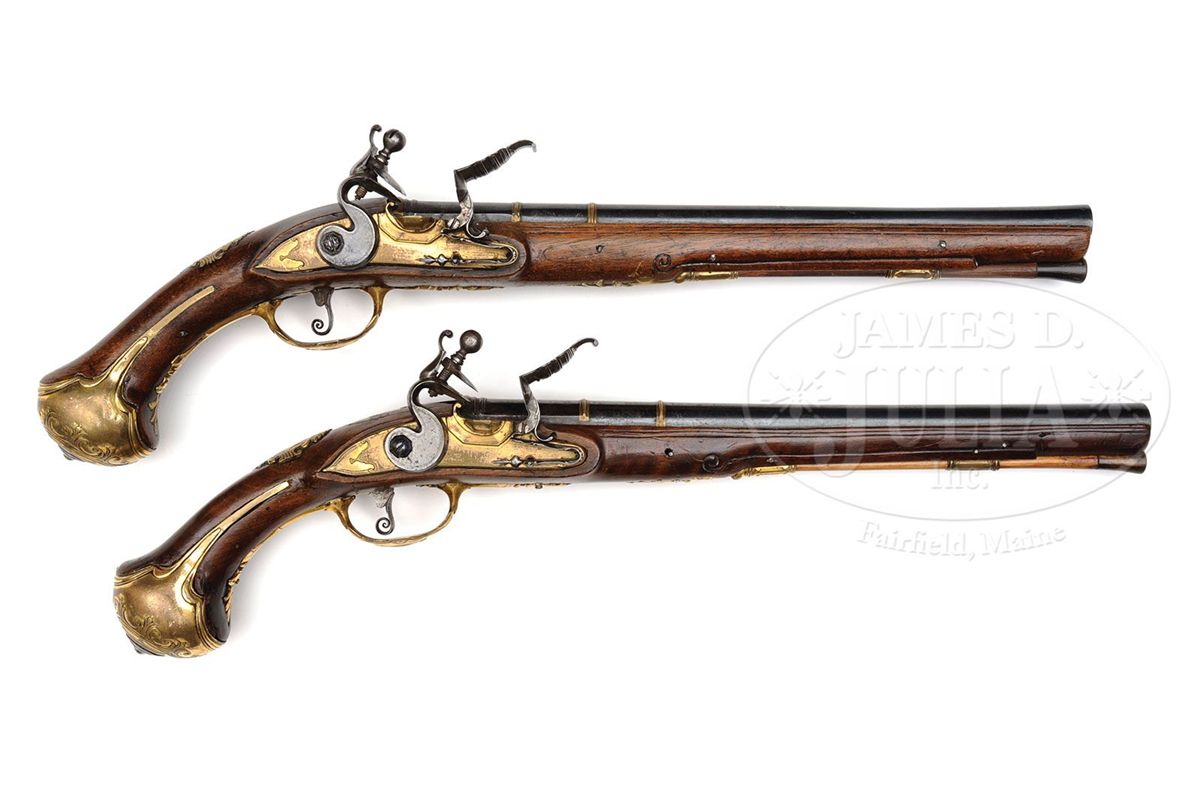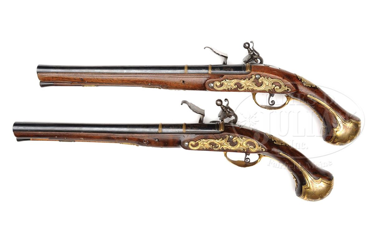 NSN. This handsome pair of holster pistols has gilt brass lock plates signed on the bevel "P Bonafino". Fastened pans, fluted frizzens, gooseneck cocks, gild brass furniture comprising of spur buttcaps finely engraved, sculpted trigger guards finely cast. Leafy meander sideplate of gild brass, rnd bbls with three bands. Straight grain walnut full stocks. NOTES: A very handsome and attractive pair of long holster pistols. CONDITION: Lock plate and mounts retain orig gilding bbl retain most of an old attractive reblue. Stocks are crisp replaced during pistols working life. 4-49383